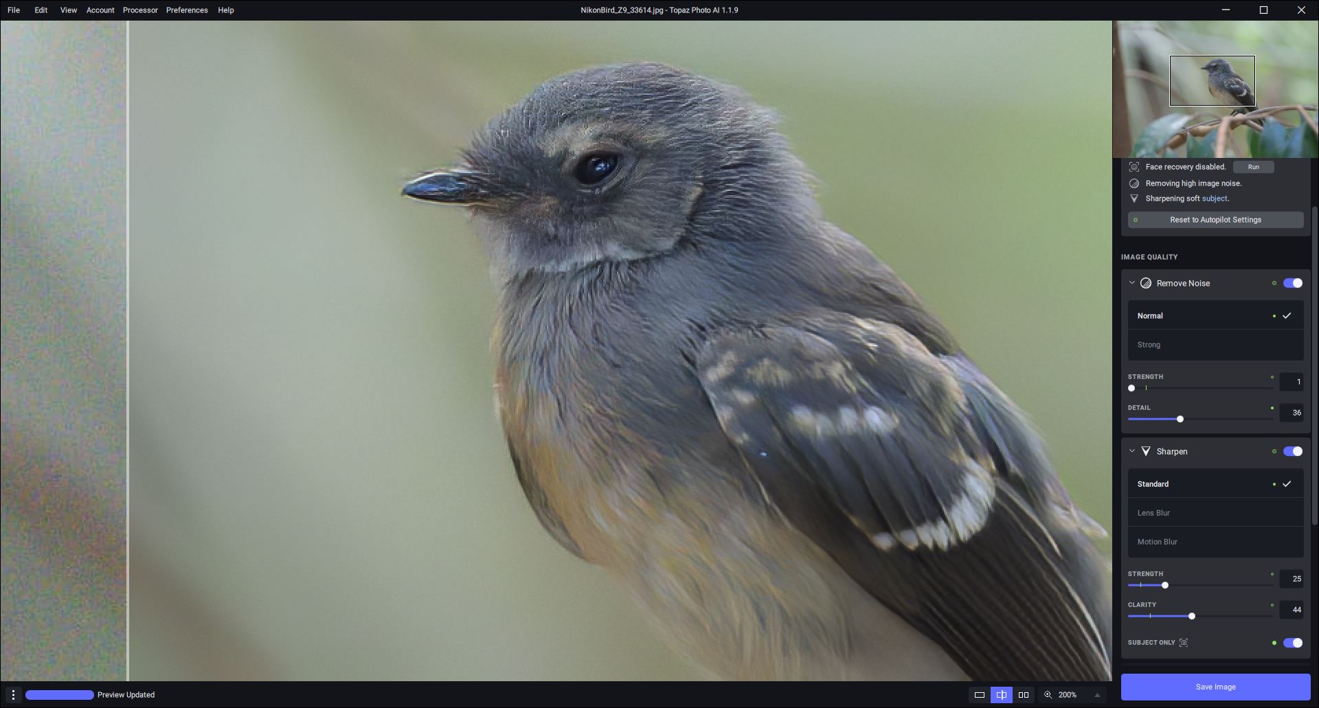 Another option to add to that - if it only gets you partway to the level of sharpening (w/out over-sharpening) you need - what happens if you mask just the bird (or some portion of the bird you’d like sharper) and then in the Sharpen area of the settings panel, you turn on the sharpen subject only? You’ll likely have to do trial & error on the sharpening & clarity so the bird feathers don’t become an illustration… Does that approach help at all? Part of the reason I’m suggesting that - besides further sharpening the bird feathers post-denoising - is to ensure your nice shallow DoF isn’t lost in the process of ‘crisping’ up the bird.
