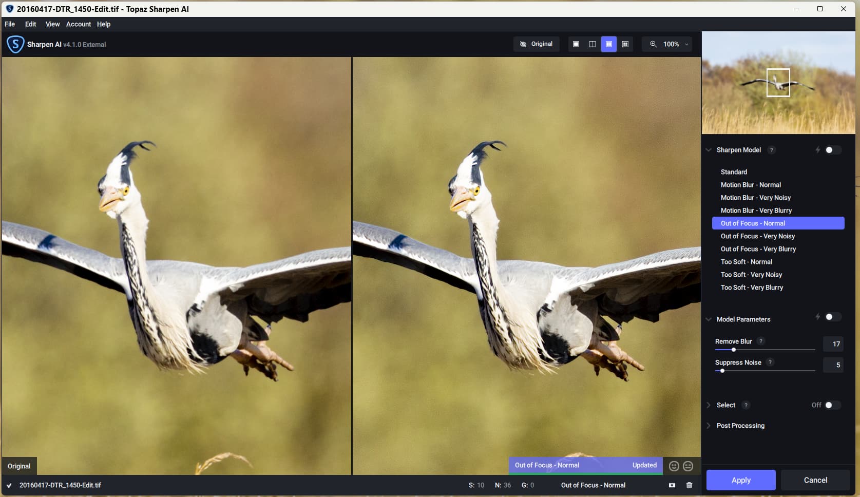 Im finding that the motion blur model is no where close to being as good as it was in Topaz Sharpen. I compared the same image in both products and Topaz Sharpen was hands down the winner with every setting. Im hoping we can get the same results in photo ai in the near future.