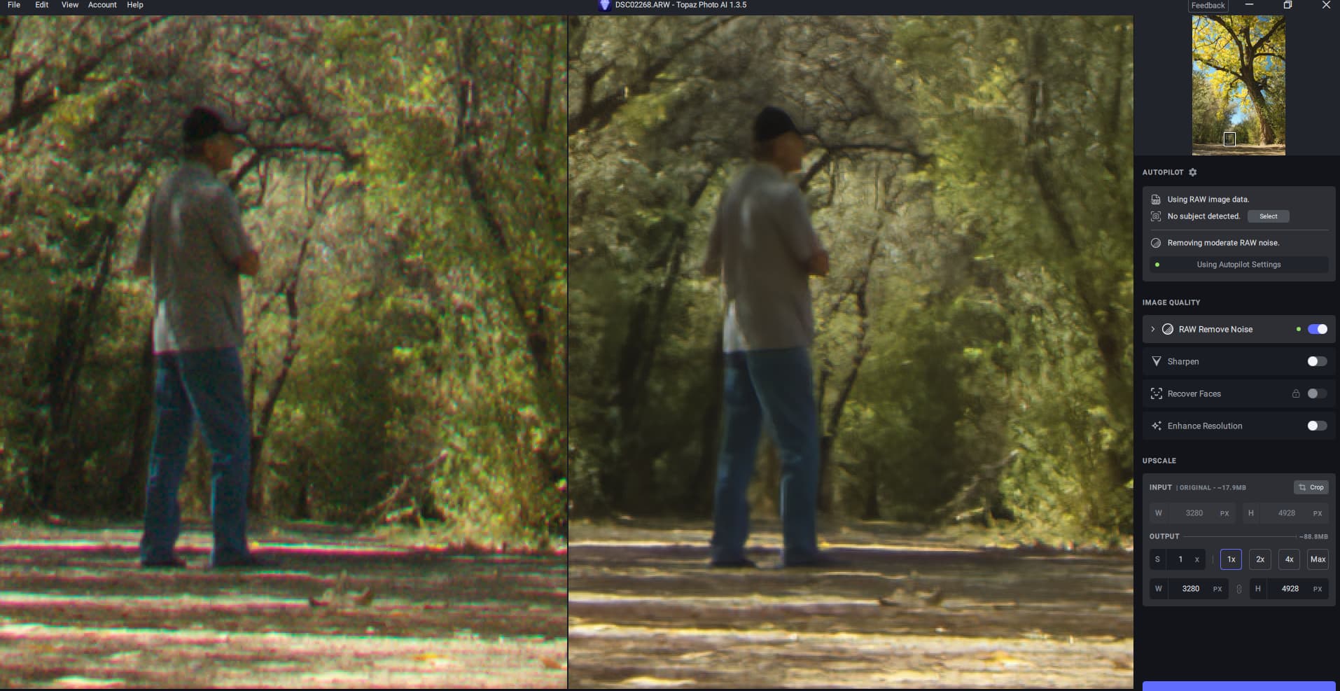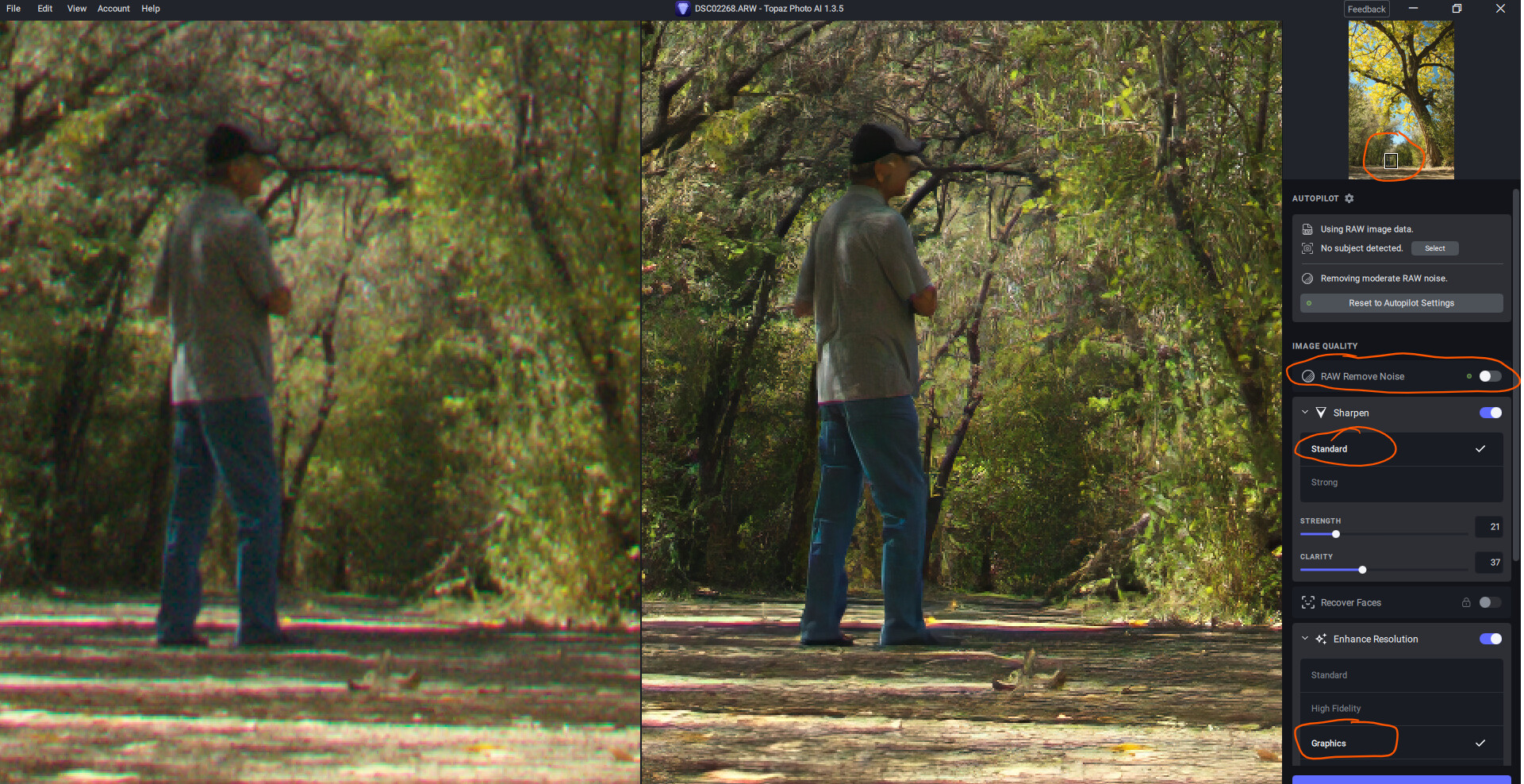 This is a comparison of what Auto Pilot settings do vs my manual settings. As you can see I did turn off the RAW remove noise.