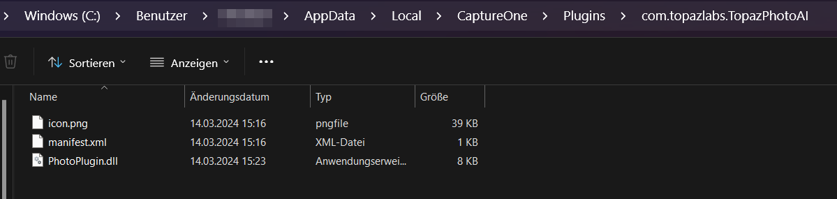 Copy the whole content of the folder “com.topazlabs.TopazPhotoAI” into the coresponding folders located in "C:\Program Files\Topaz Labs LLC\Topaz Photo AI" and "C:\Users%user%\AppData\Local\CaptureOne\Plugins", where %user% is your Windows user name.
