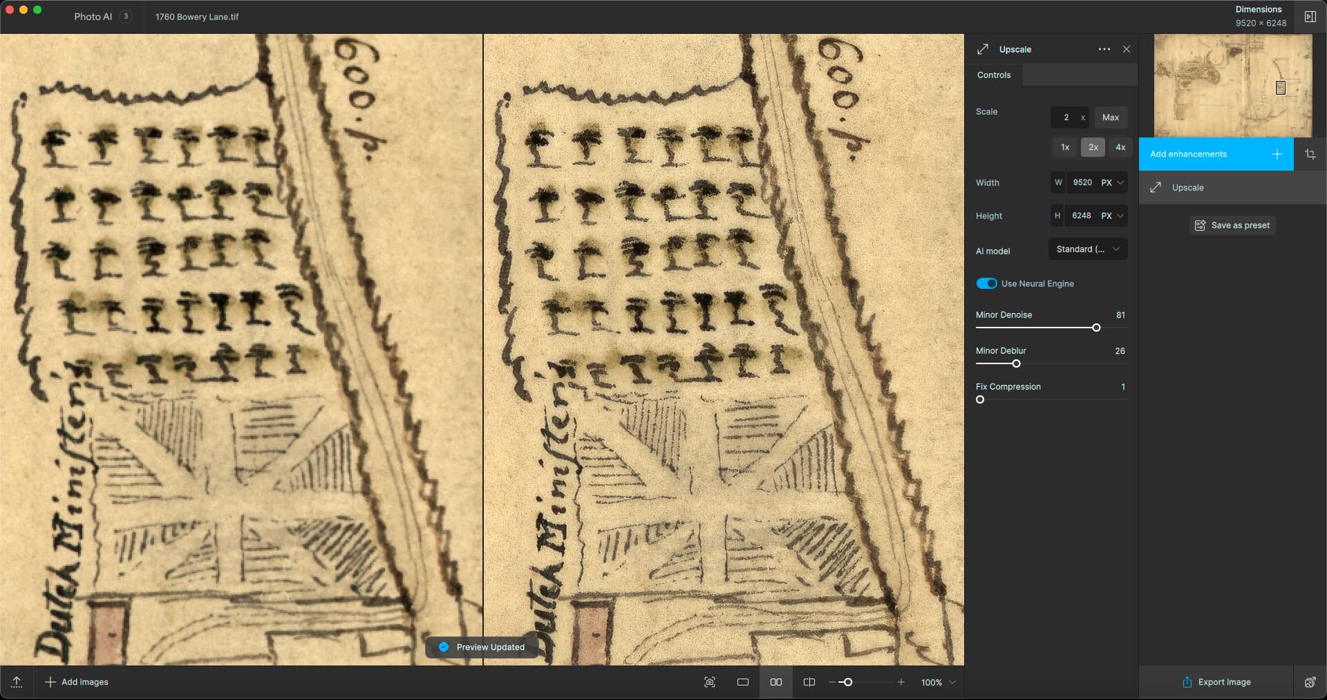 I think I like to denoise within Upscale better than adding DeNoise as an additional enhancement (the latter result looks “cleaner” but details are “dirtier”, especially the handwriting):