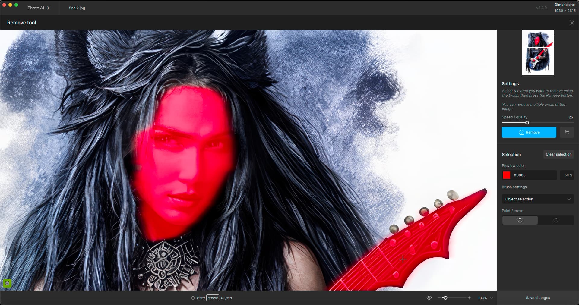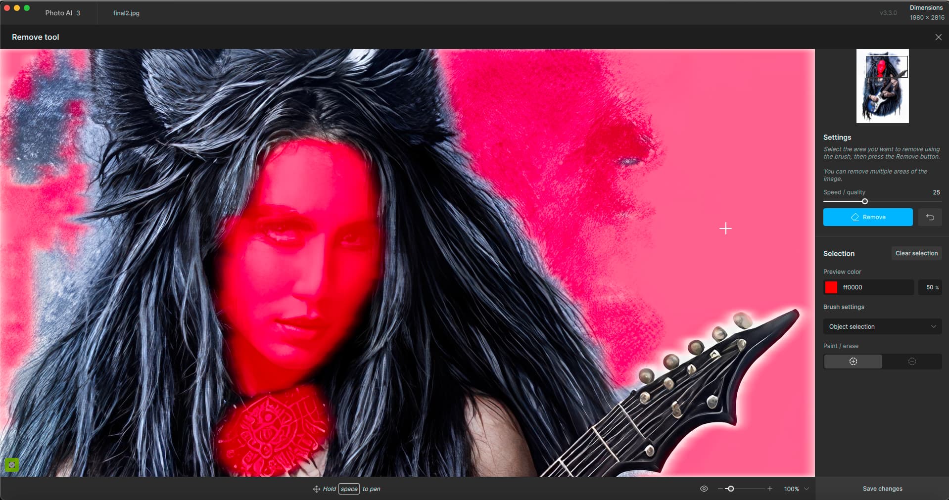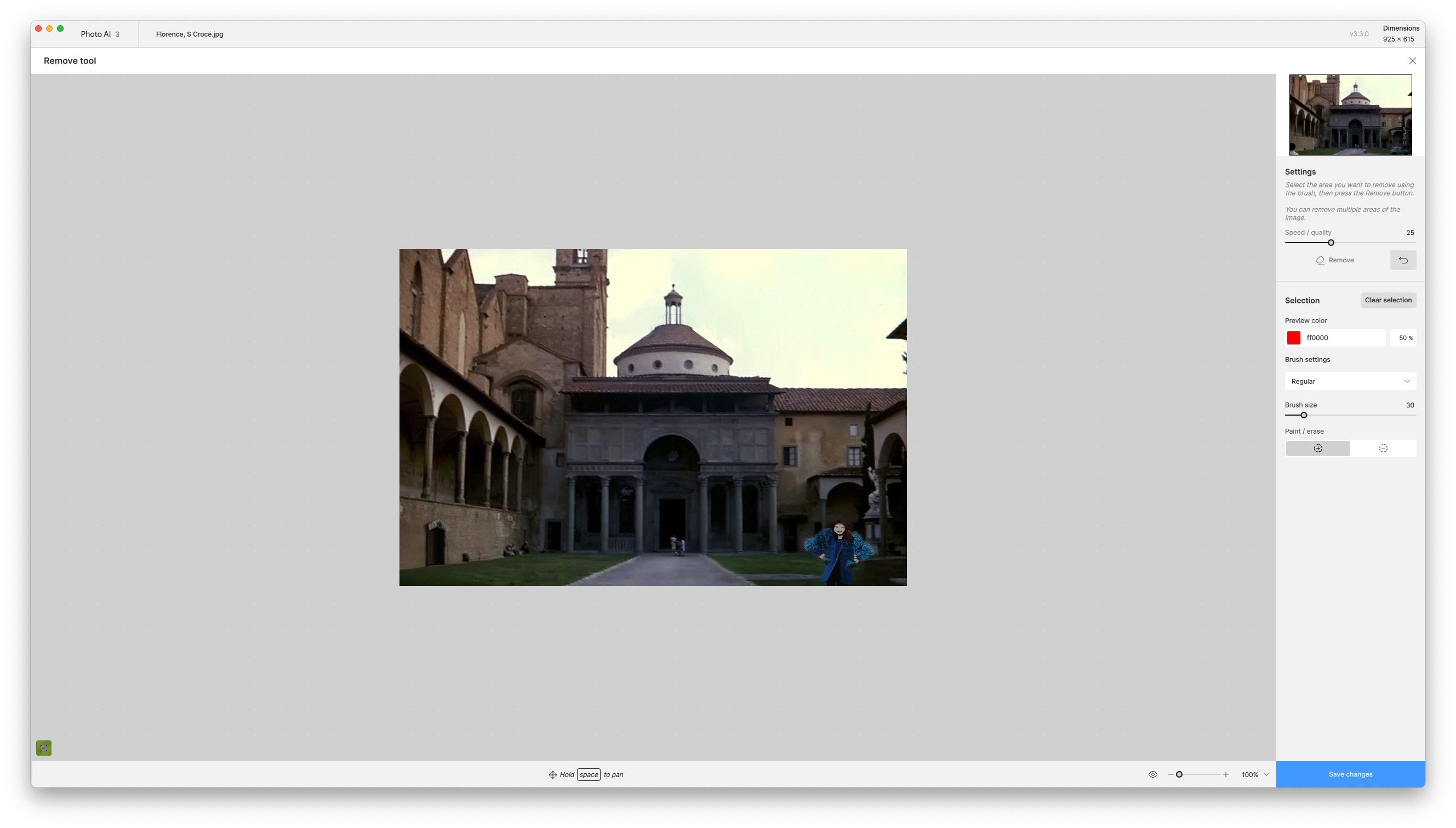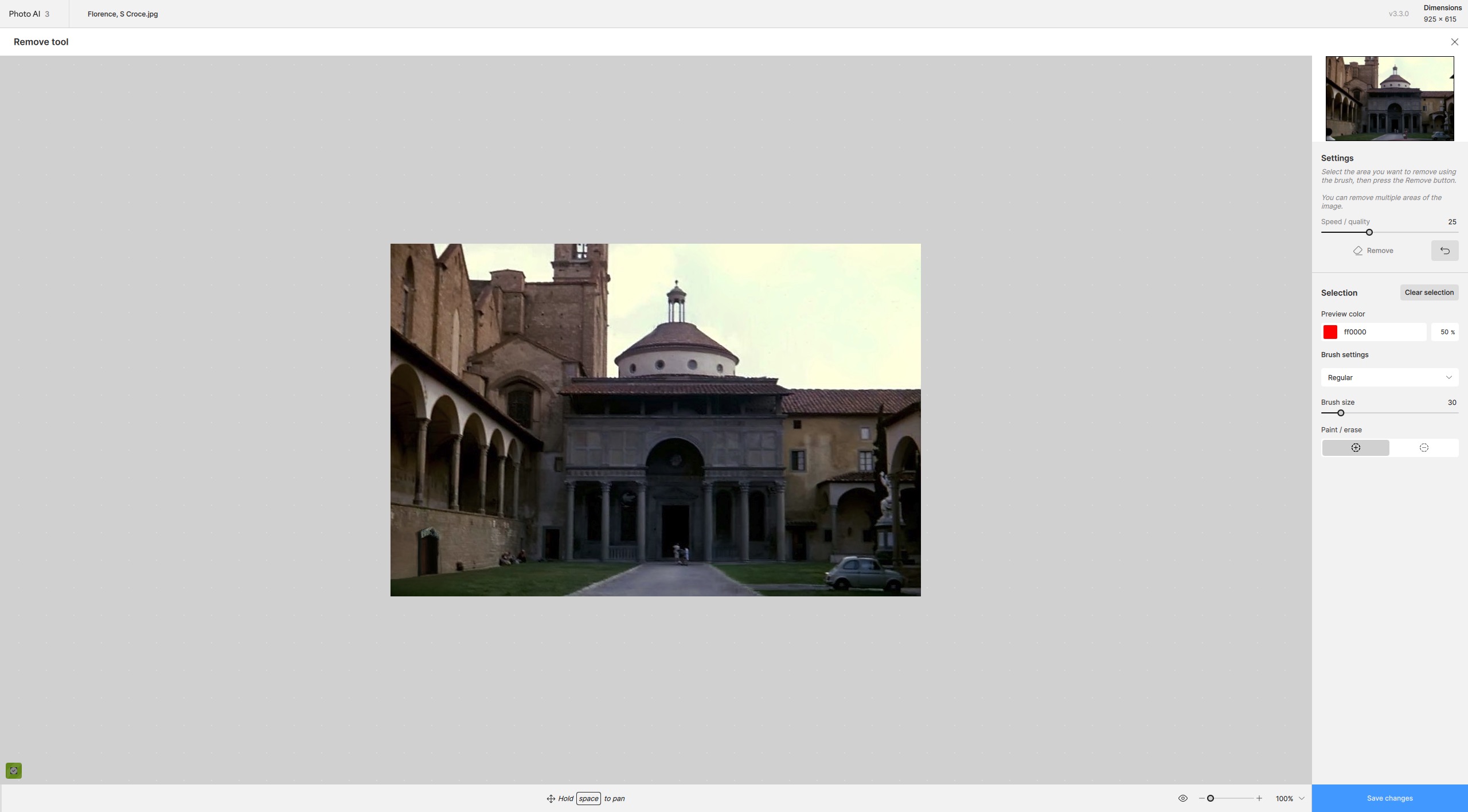 The remove tool did a good job on the person on the bottom left, the car roof and woman in the centre and the building elements on the sky right, but failed completely with the car. After five passes, where the car was replaced by a computer-generated cartoon image, I gave up!