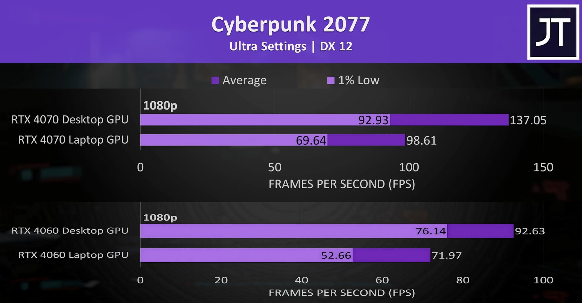 For instance, consider Cyberpunk 2077: the RTX 4070 Desktop averages 137 fps, whereas the RTX 4070 Laptop only reaches an average of 98 fps, similar to the Desktop RTX 4060ās 92 fps.