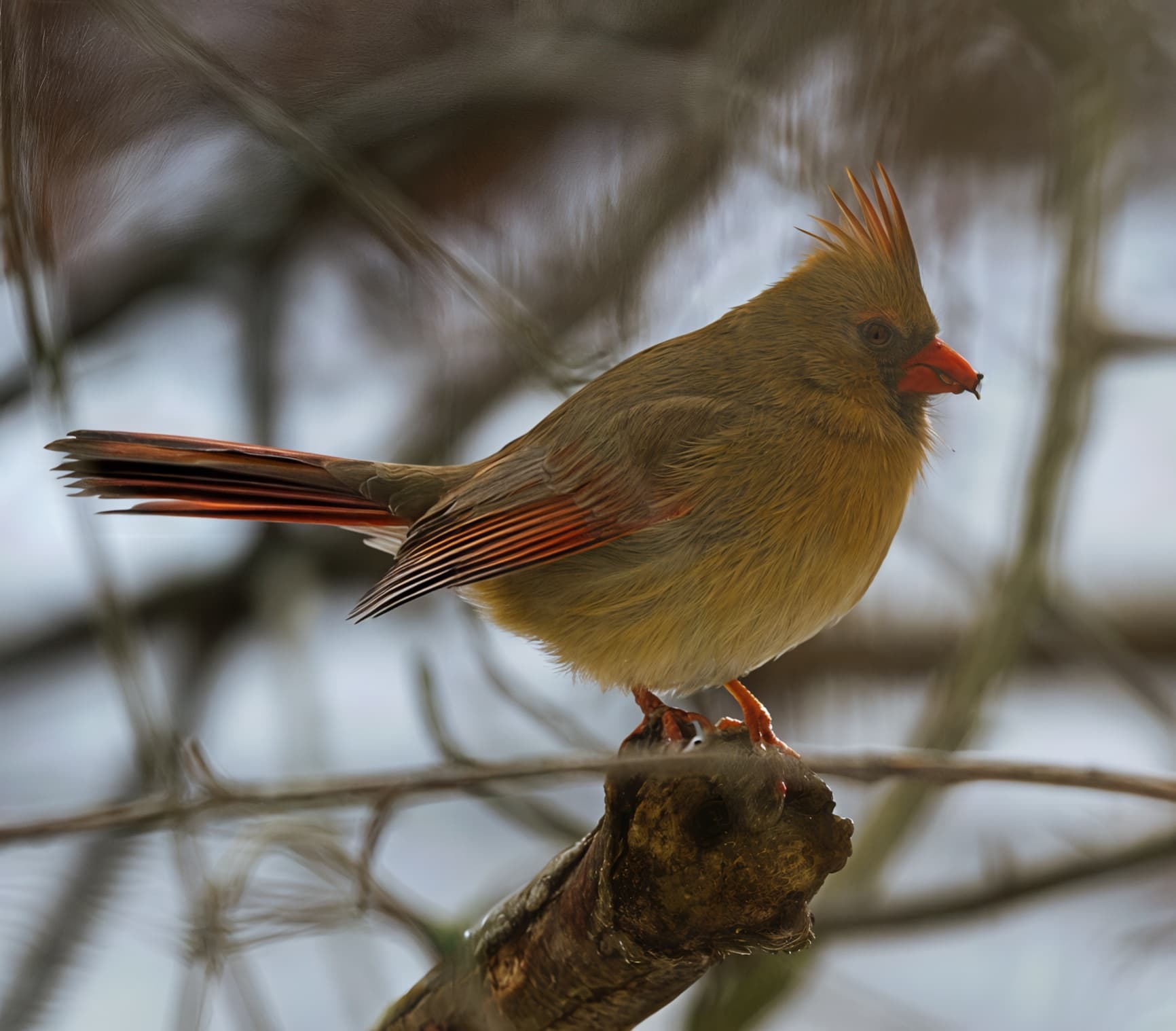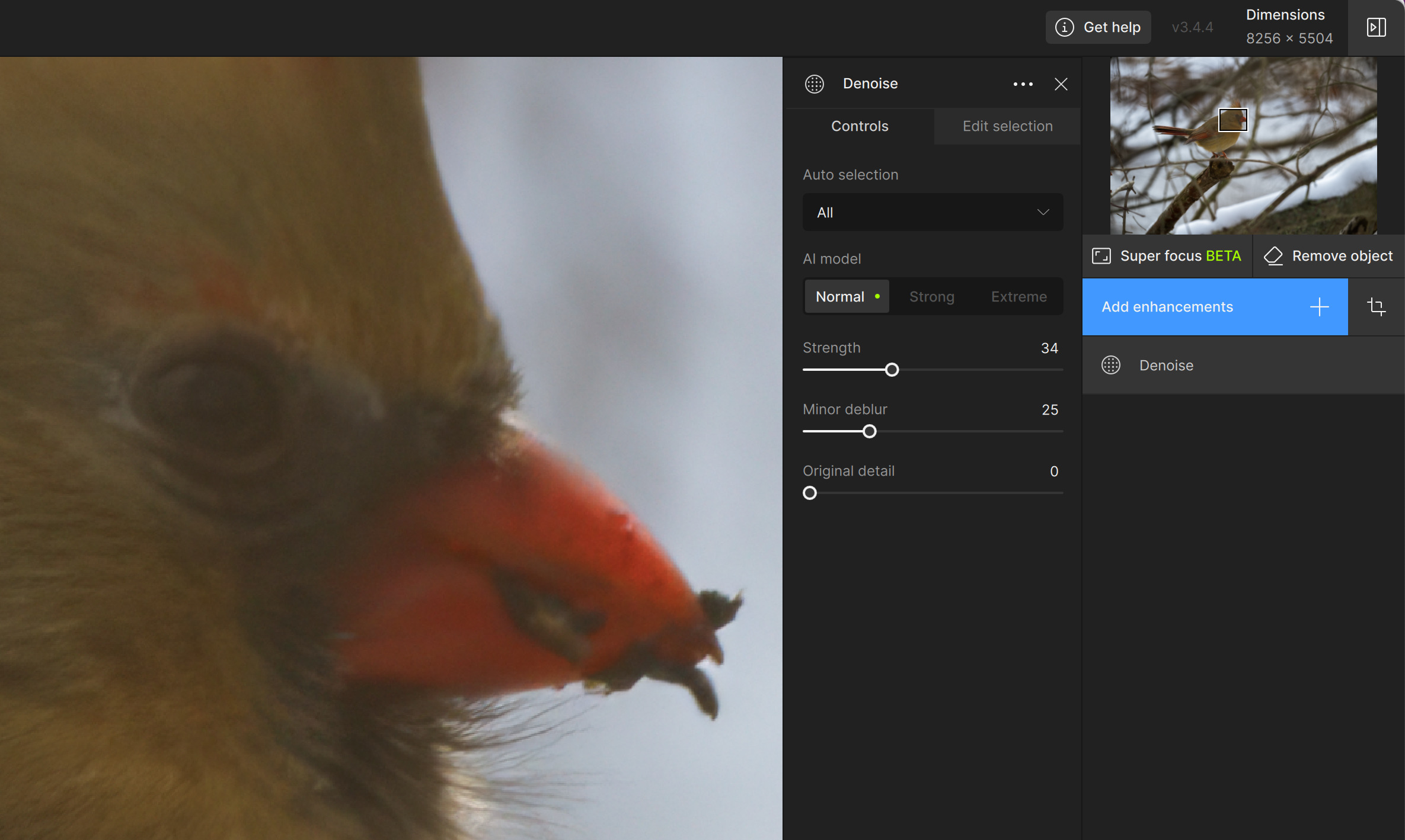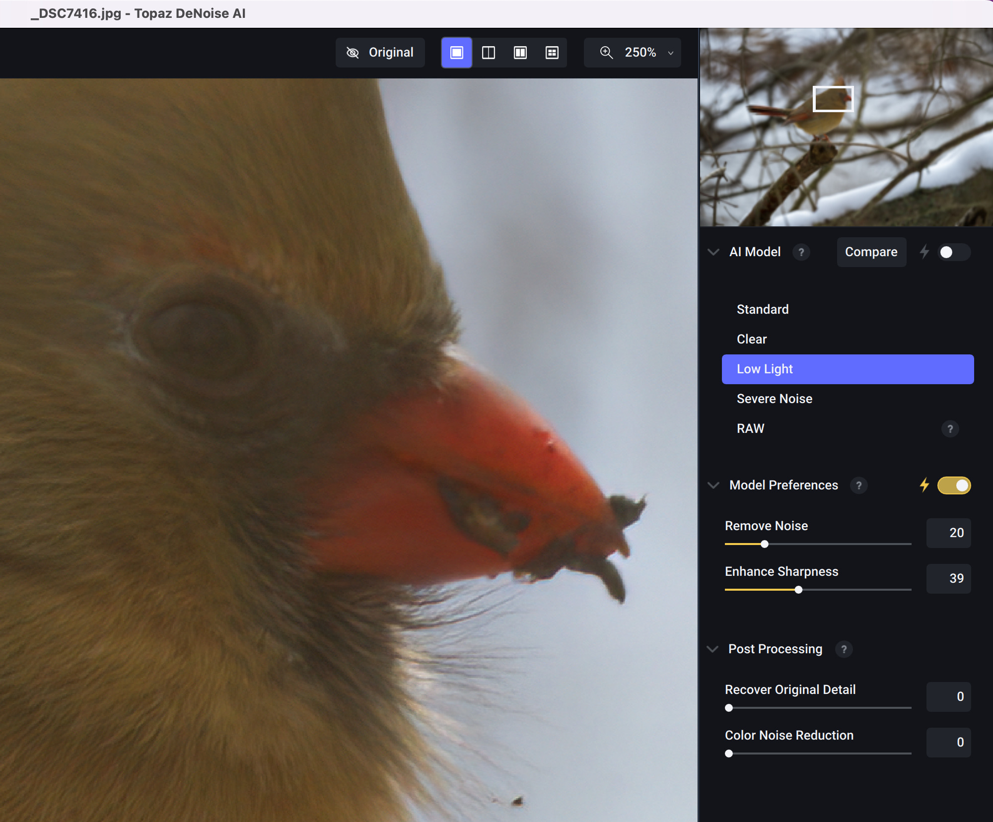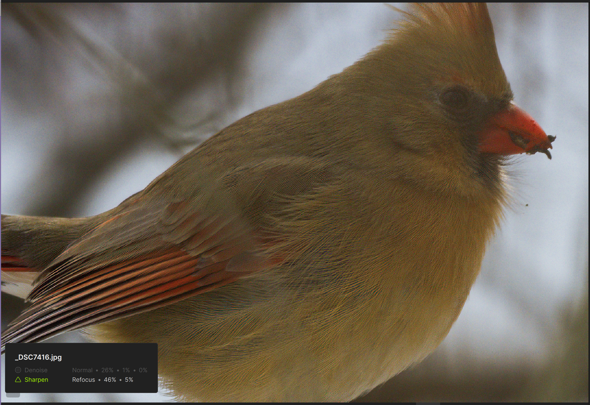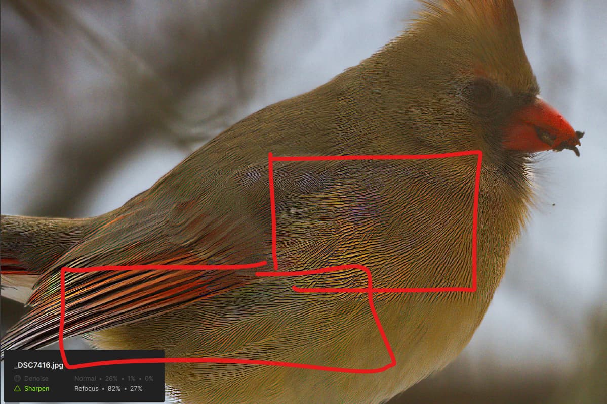 I also ran it through GPAI Recover, and discovered that it had trouble with enlarging a few of the JPEG compression artifact areas resulting in a square edge in the blurry part of the Female Cardinal’s breast.