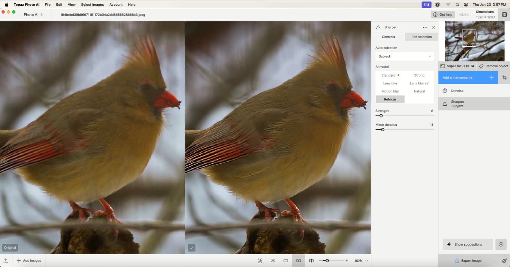 There is 2 tiles, on the feathers, and this is not the Grid issue that happens on Denoise and RAW Denoise on some skies/backgrounds. This is different and a processing error most likely created by a wrong AI Model used (There is no missed focus here, Refocus should not be the model used - There is Denoise used as well, on a JPEG file, curious to see if there is noise in the original), or it could be a missing or corrupted AI model, which we can rsolve. We can test this once we have Michael’s file!