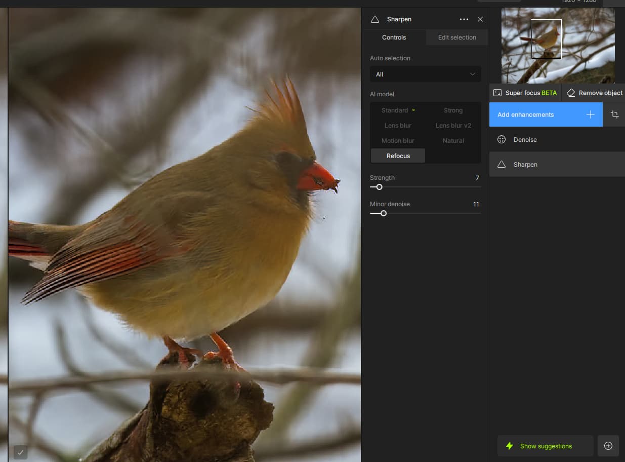 Additionally, I would not recommend Refocus on this, there is no missed focus here, Standard Sharpen AI model will give better results. I use refocus on my example to match what you had used