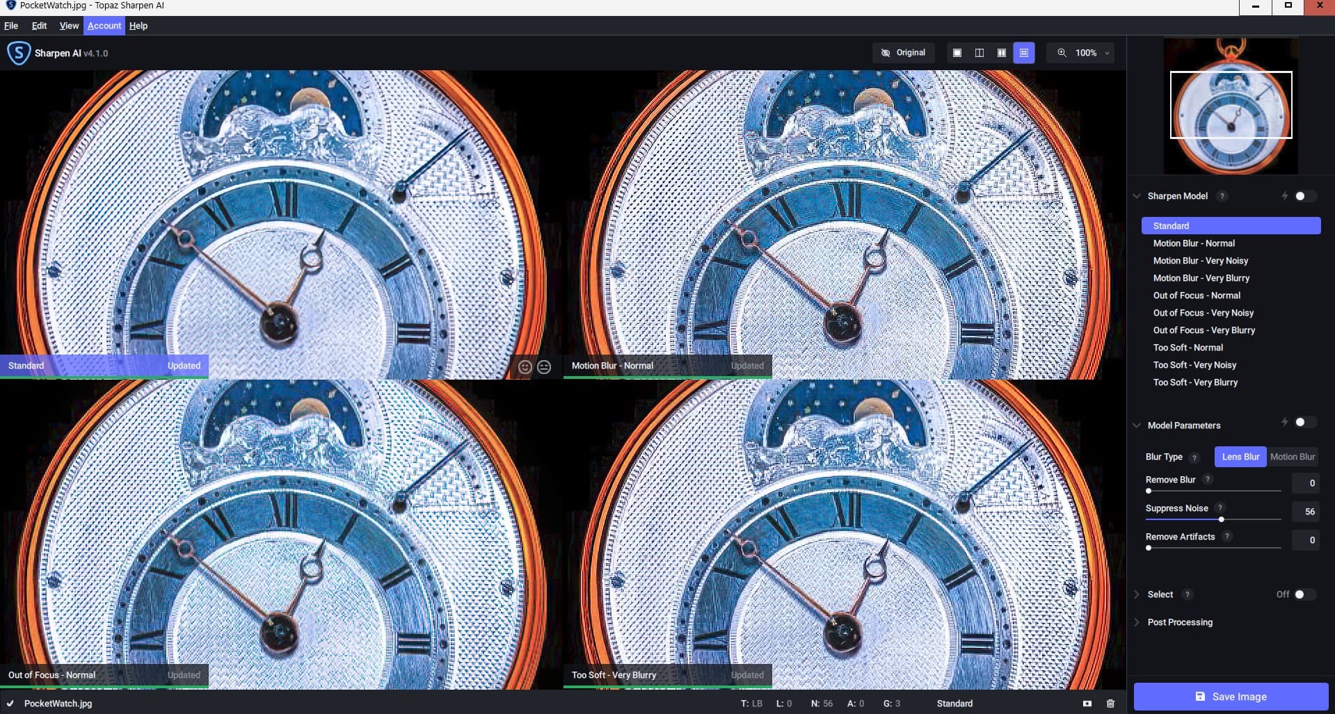 Sharpen AI (4.1.0) - Not only multiple models that improve the Original and some give it a terrific, more dimensional look, but a great Comparison View for Sharpening - that easily lets users see tradeoffs of which sharpening models are most effective for any given image in the UI. And… only one, single Settings Panel at far right of the UI (no pop-outs):