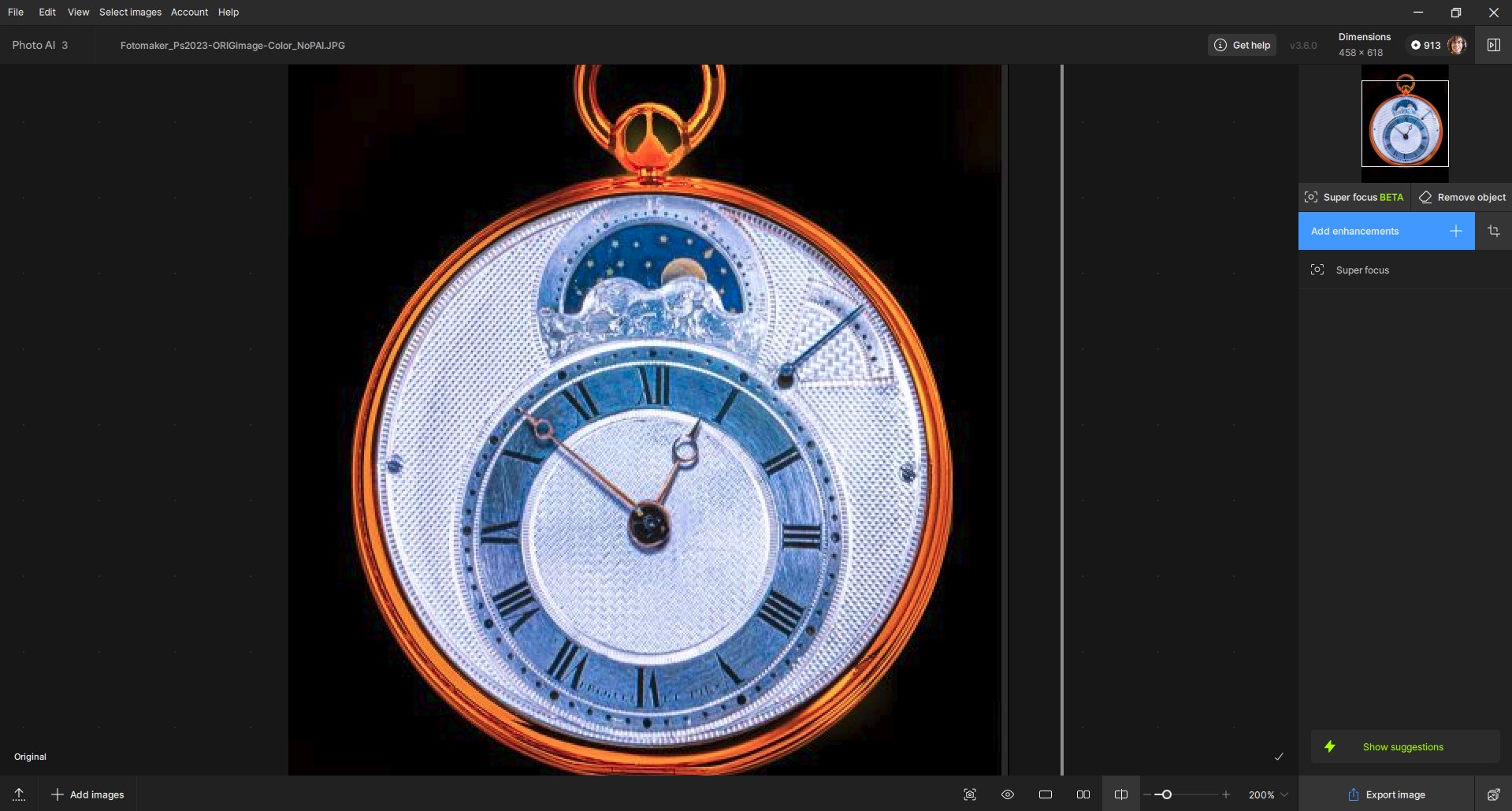 Image 1: Image that I wanted to super Focus, ends up completely blurred and lacking details in a very detailed pocket watch using superFocus v2 and Subject selected.