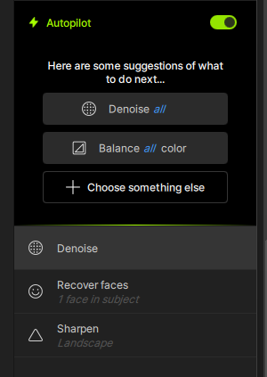 when you manually bring in Denoise or any Enhancements after Autopilot has applied itâs recommended Enhancements in this case, Recover Faces and Sharpen, Photo AI is merely placing the the latest Enhancement you applied on top of the stack so, any further Enhancements you apply will be placed on top.