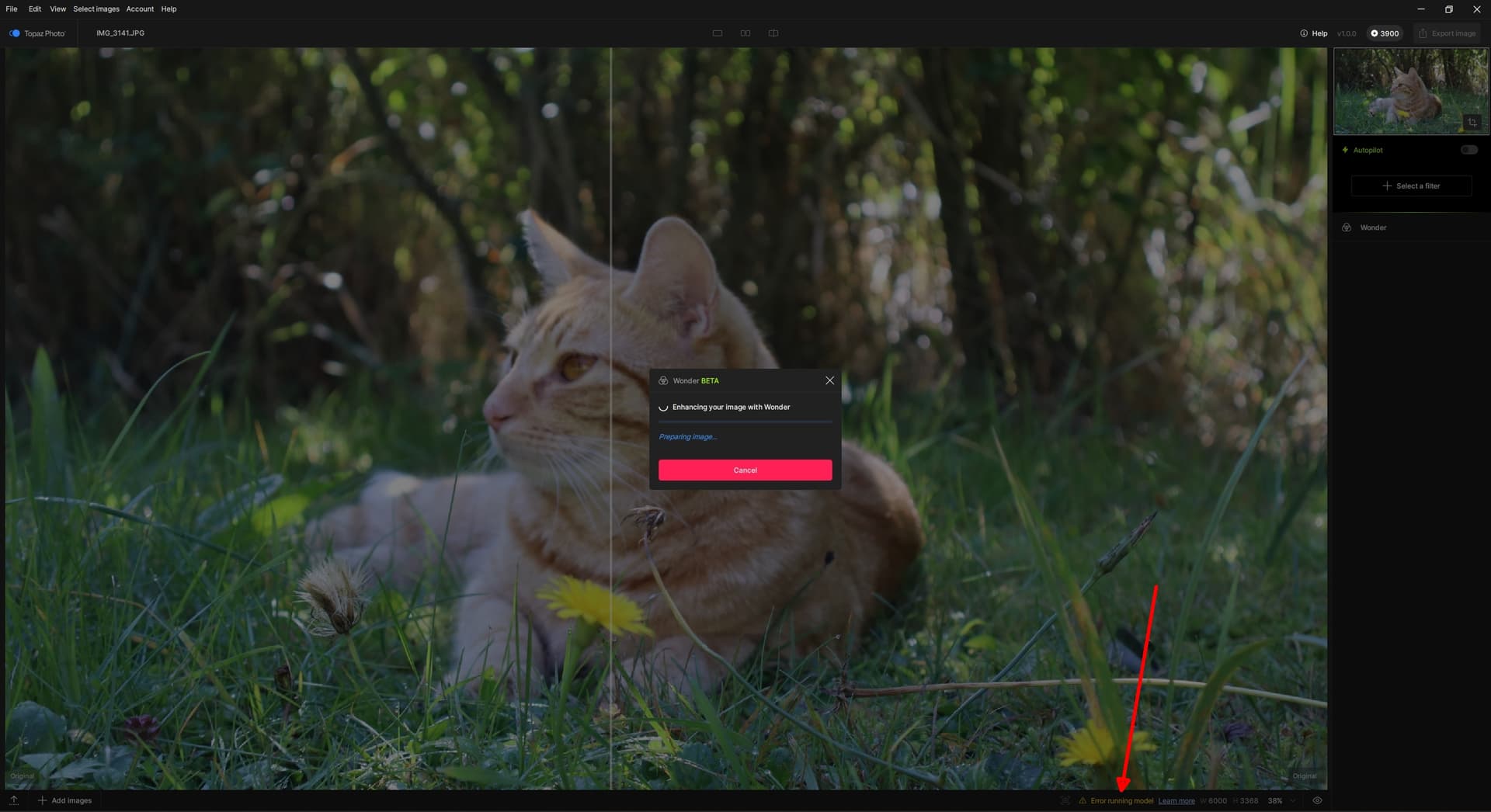 Yes, I have, but always without success. After some time, a yellow notification “Error running model” always pops up in the bottom right (the red arrow I added points to it in the attached picture) and then nothing happens, only the white wheel in the “Preparing mode…” window spins endlessly. But the model is probably running in Topaz Lab, so I don’t know what’s wrong on my side. Thanks in advance for any help.