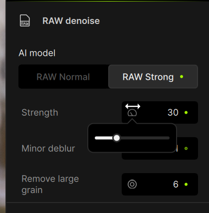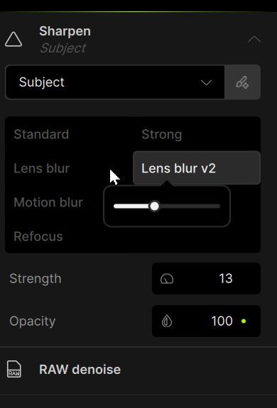So even though I can now see the Sharpen panel, the visible slider still controls the original denoise setting. The first time it happened, the slider exactly lined up with the value I was trying to adjust, and it took me several minutes to work out what was happening