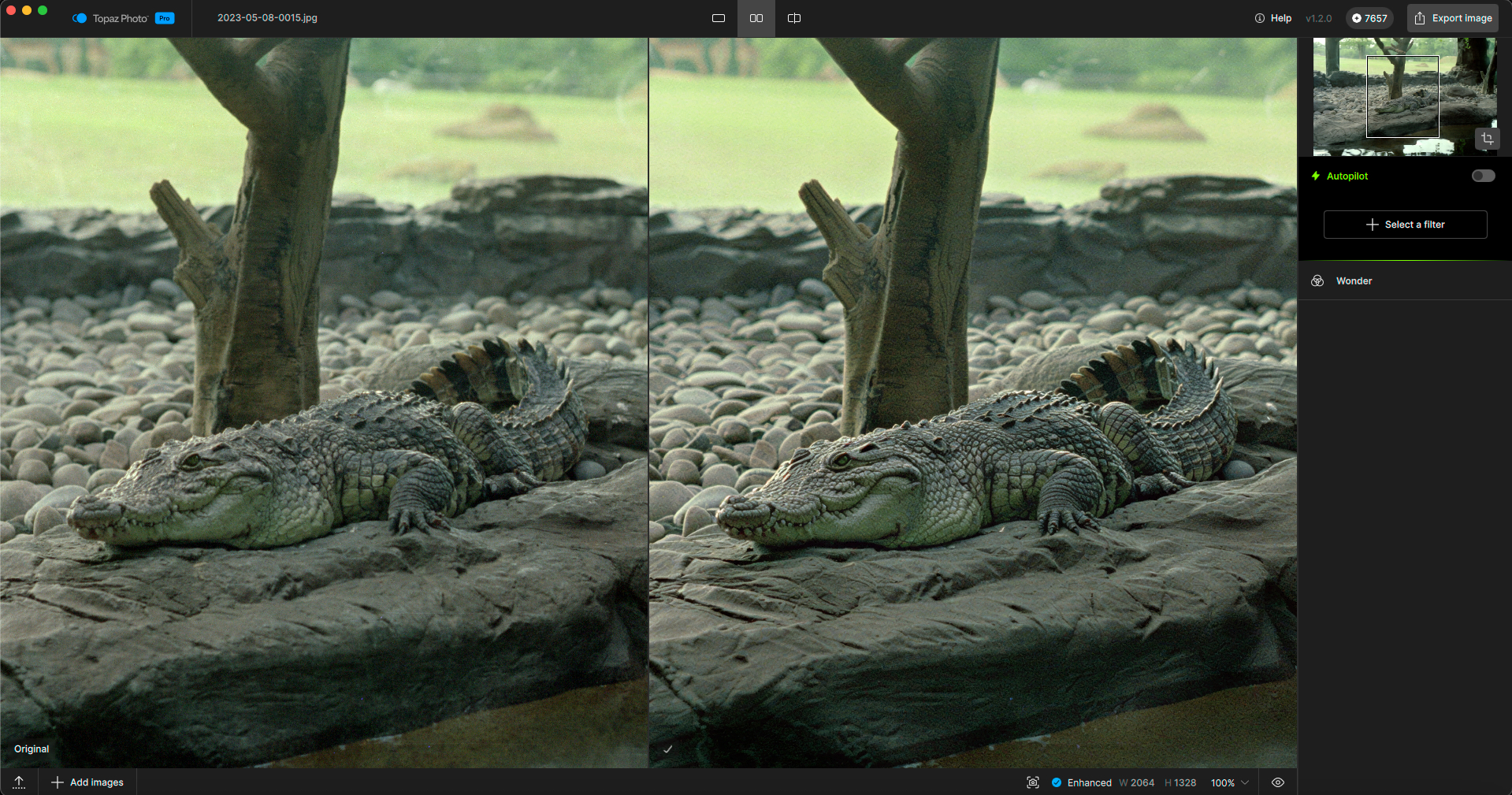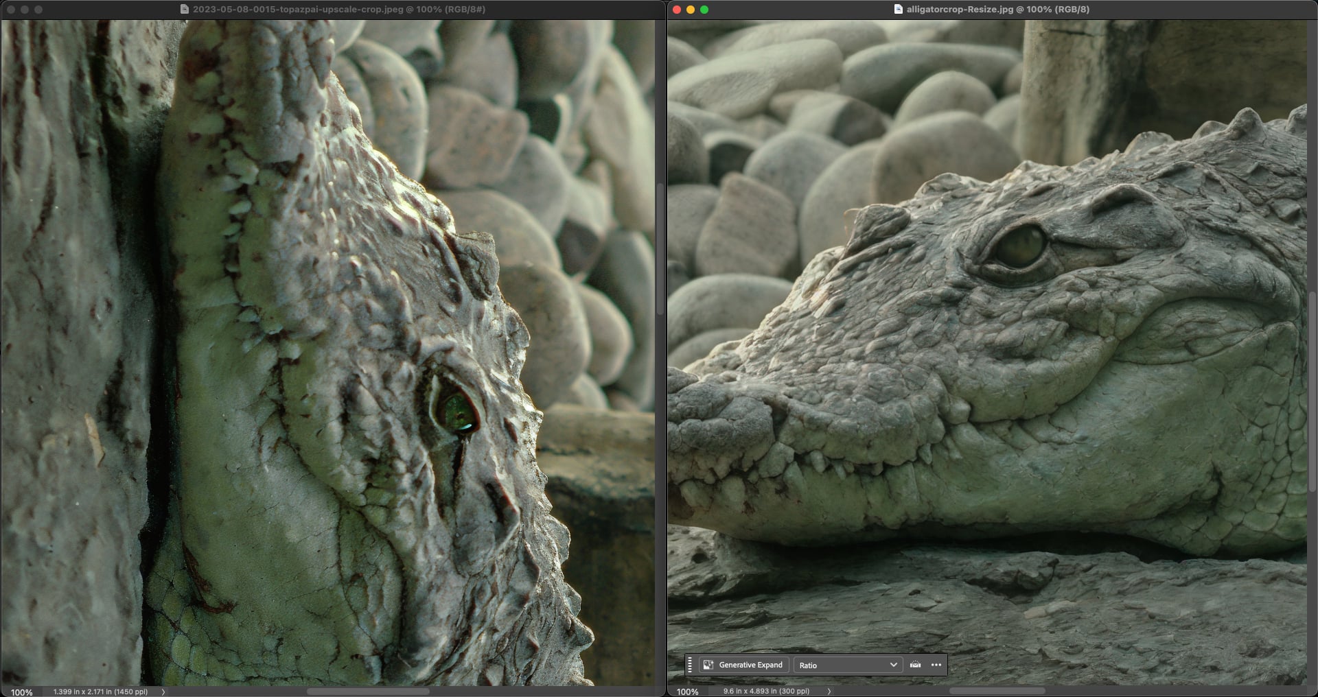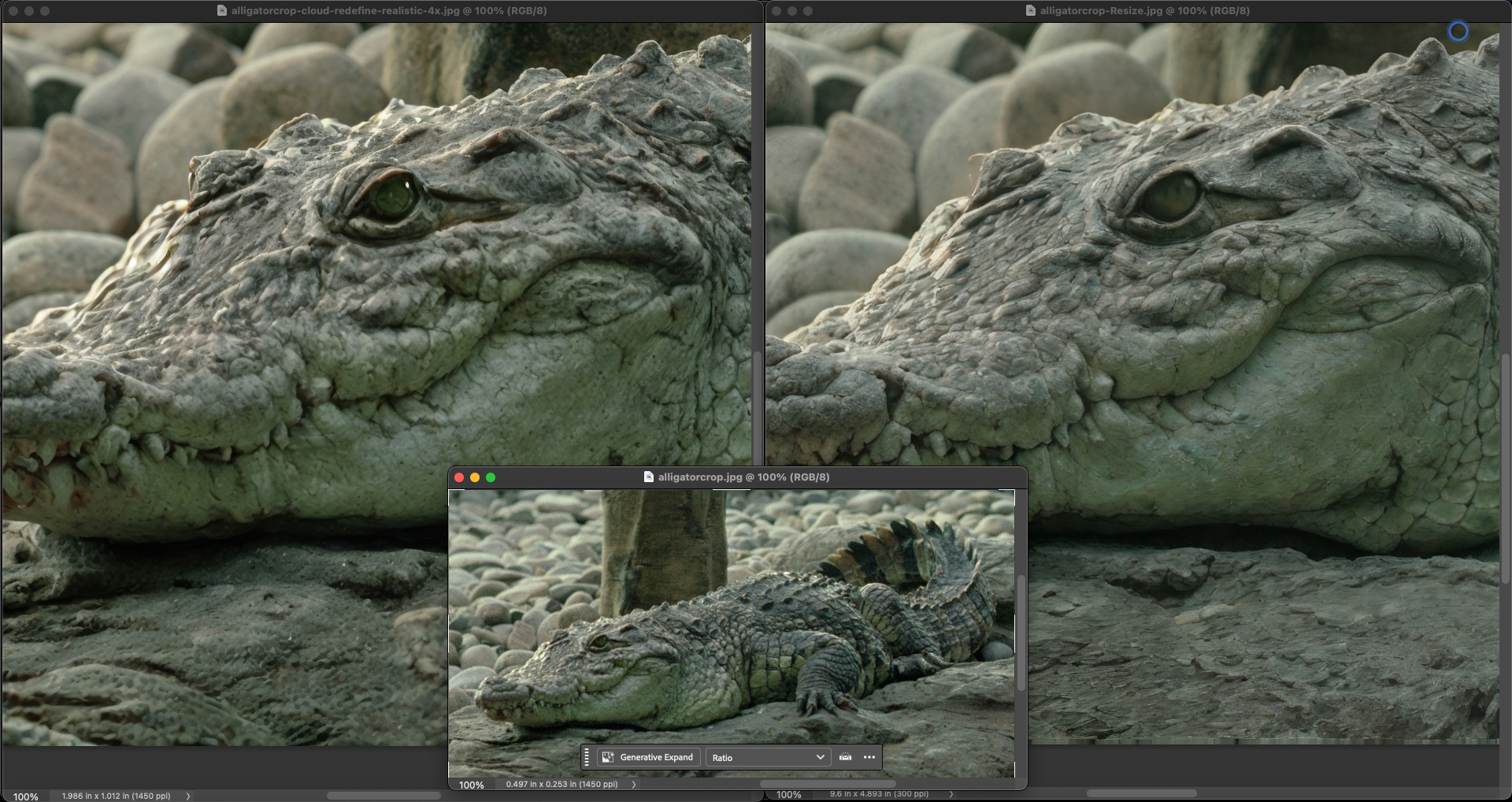 I was curious how Gigapixel would handle this vs. ON1. Redefine Realistic came closest, while Redefine>Creative/Low was sharpest, but the alligator turned into a hippo…