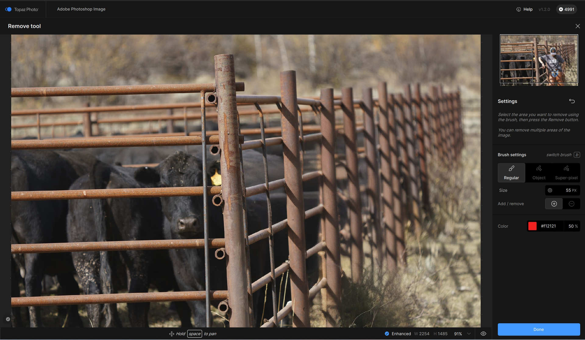 Remove v. 2 - Used combo of Object Selection Brush & Regular Brush to create overlay on cowgirl. Object didn’t go fully out to edges in some spots and missed some spots. I used Regular to make sure she was fully covered with a small margin beyond her in tricky areas like the fence.