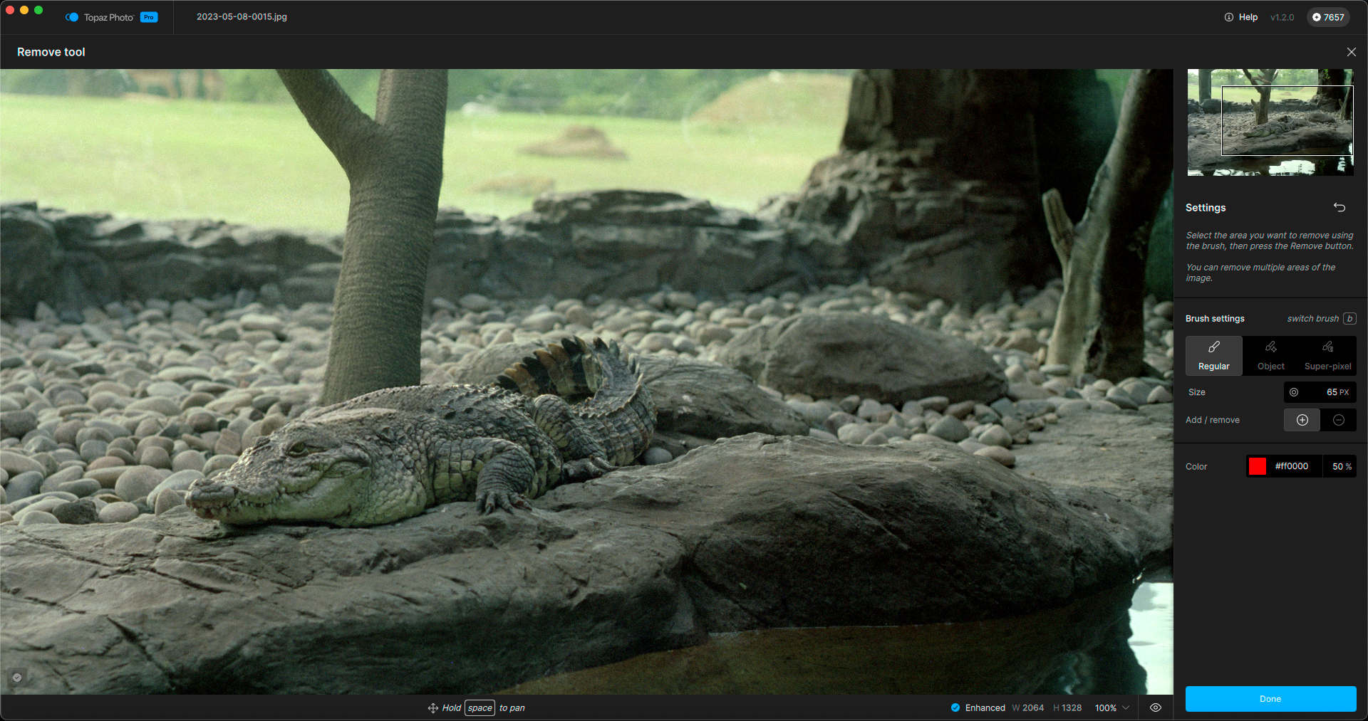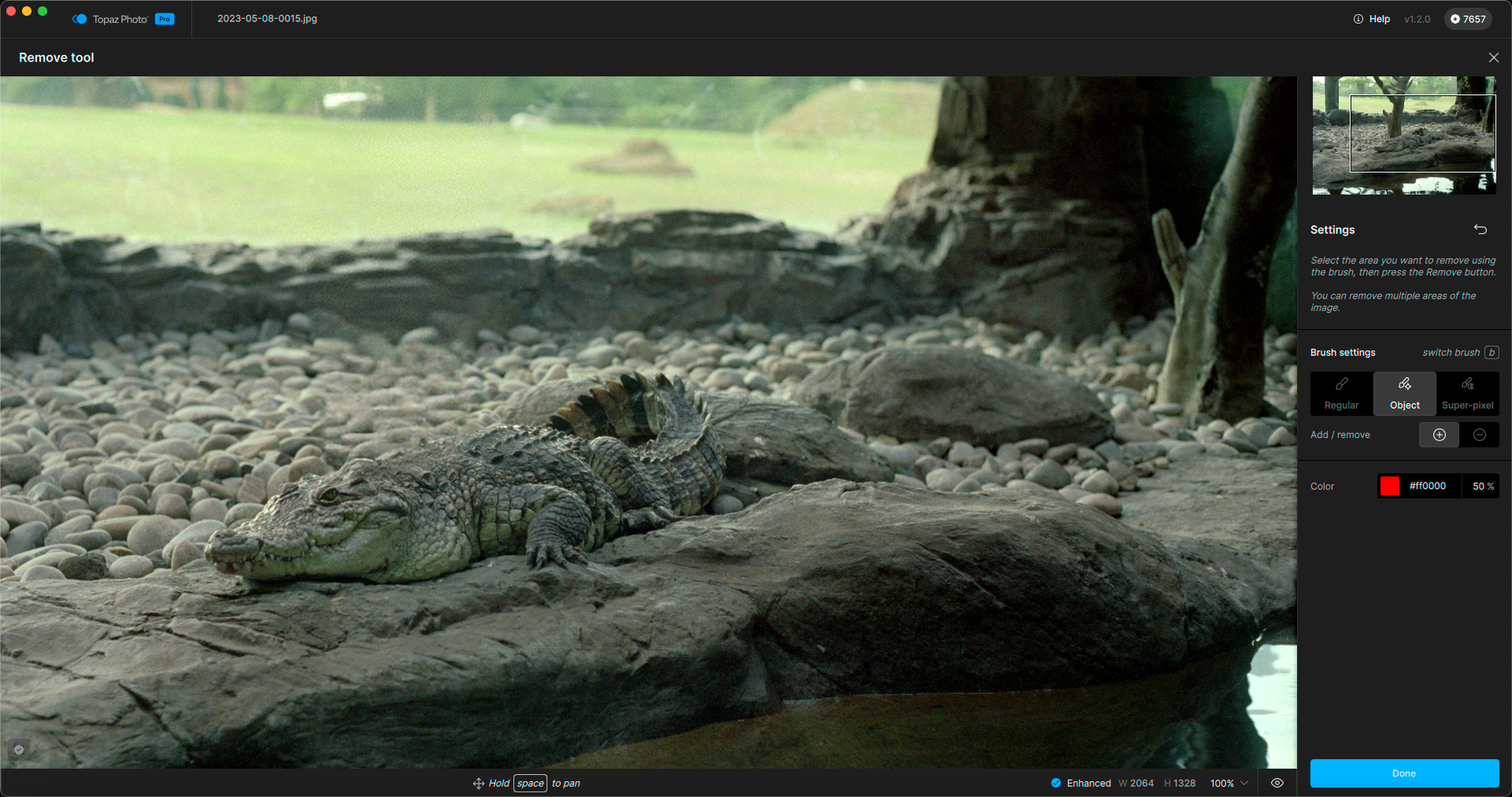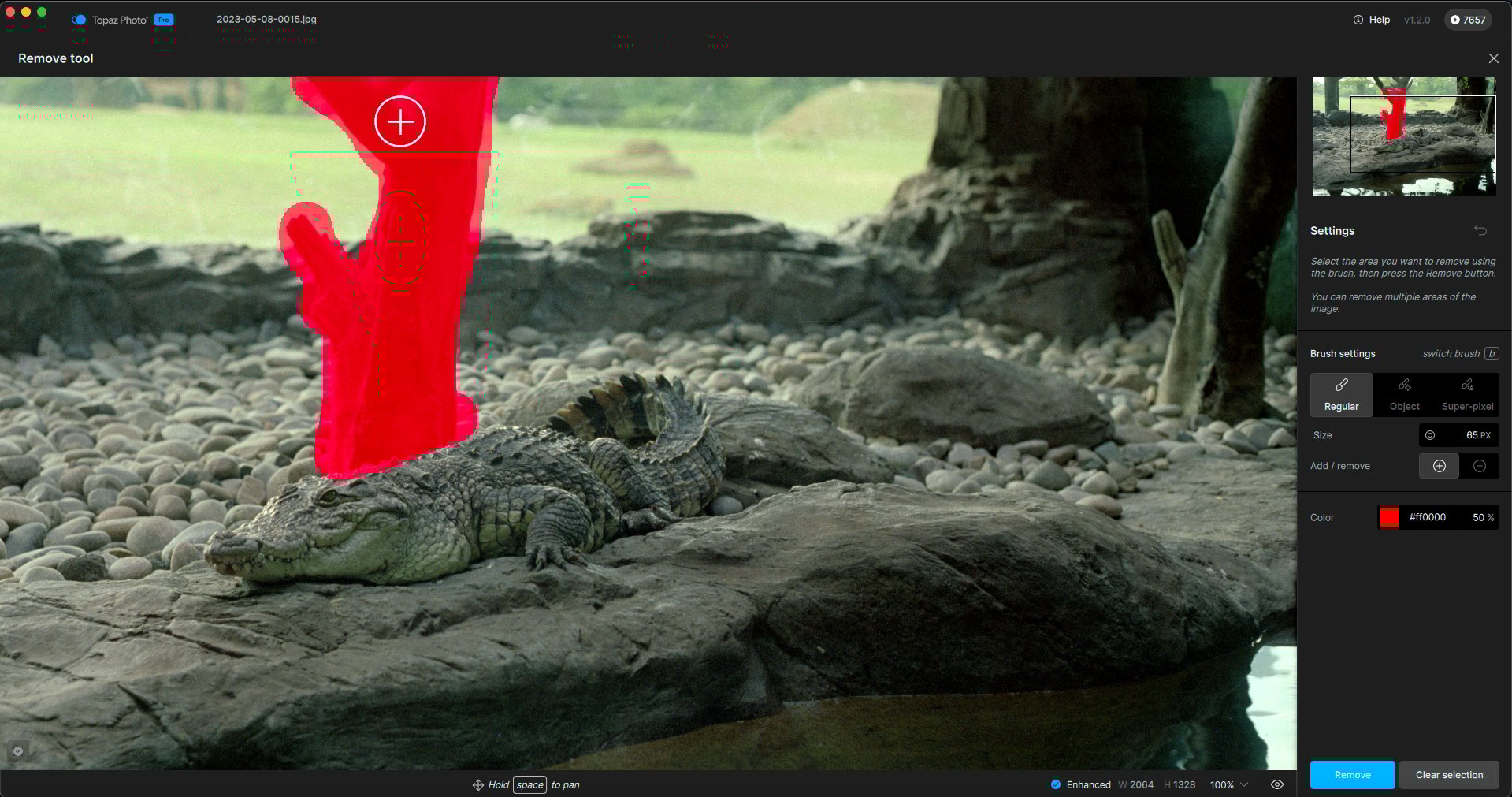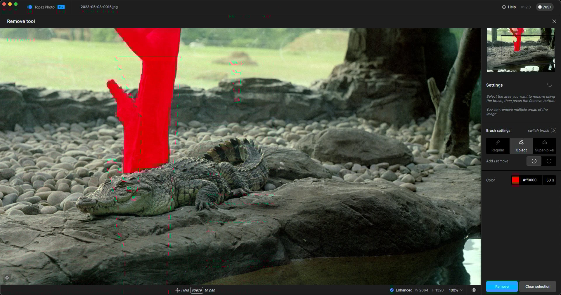 I undid the action and next tried the Object option. The tree was selected except for the extreme edges, and while the removal was successful, it still altered the alligator (removed some of his “bumps”):