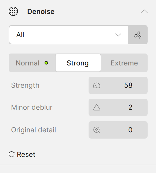 Using Denoise on a file that has no noise will force the model outside its intended purpose and can introduce artifacts. If you still want to force a Denoise here, make sure to increase the Original Detail slider to around 75% to minimize artifacts. However, the correct approach here is to skip Denoise entirely and use the proper Upscale model instead.