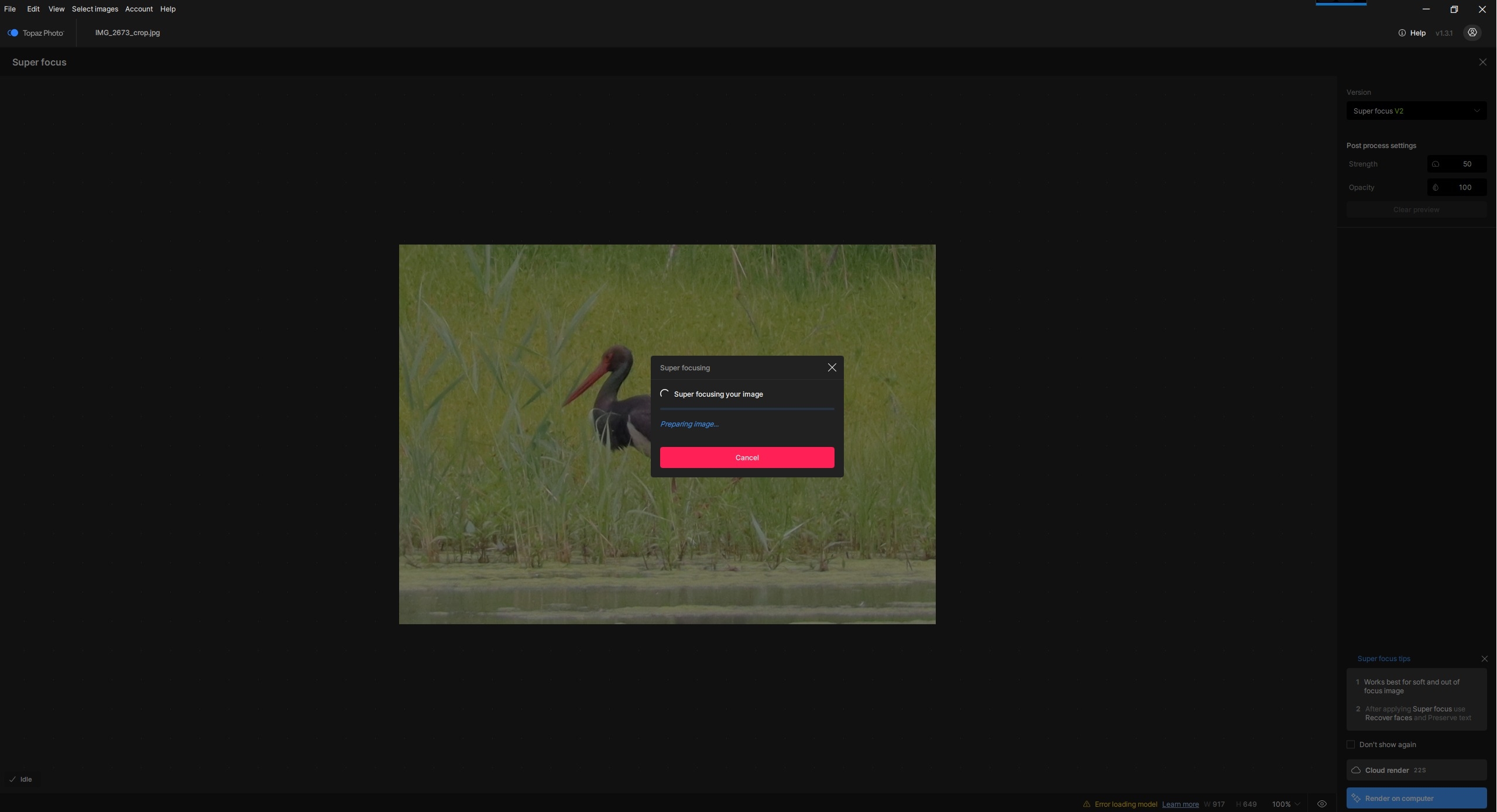 The result is still the same. “Error loading model” upon Super Focus 2. Doesn’t matter if I cloud render or local. Doesn’t matter if I load the photo directly or call Topaz Photo from Capture One (as I usually do).