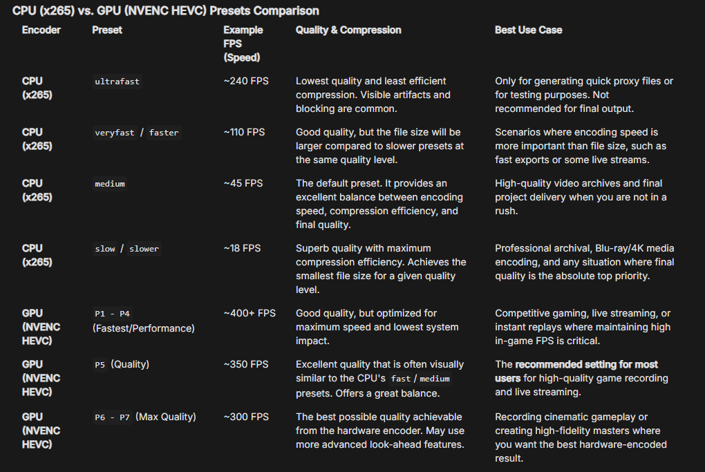 CPU encoding is slower, but it gives you better quality at lower bitrates so is the optimal choice for storing video. GPU encoding sacrifices compression efficiency and quality for speed and is designed for streaming.