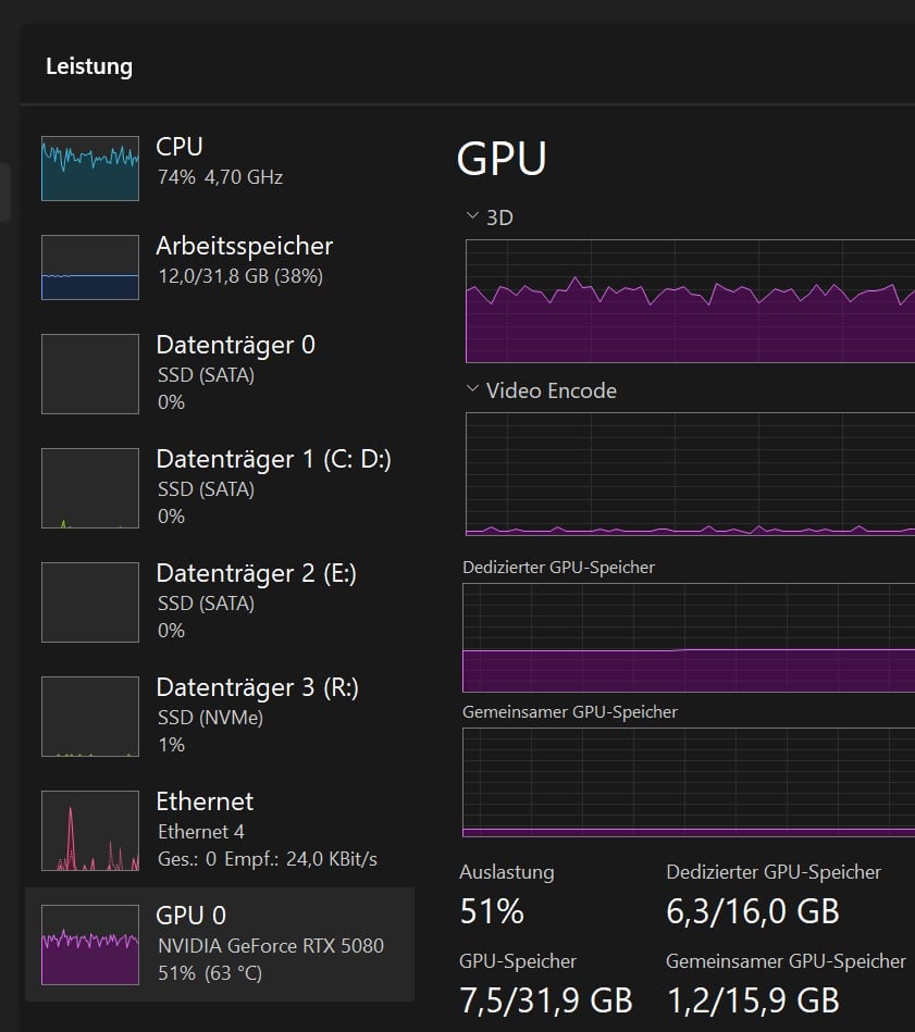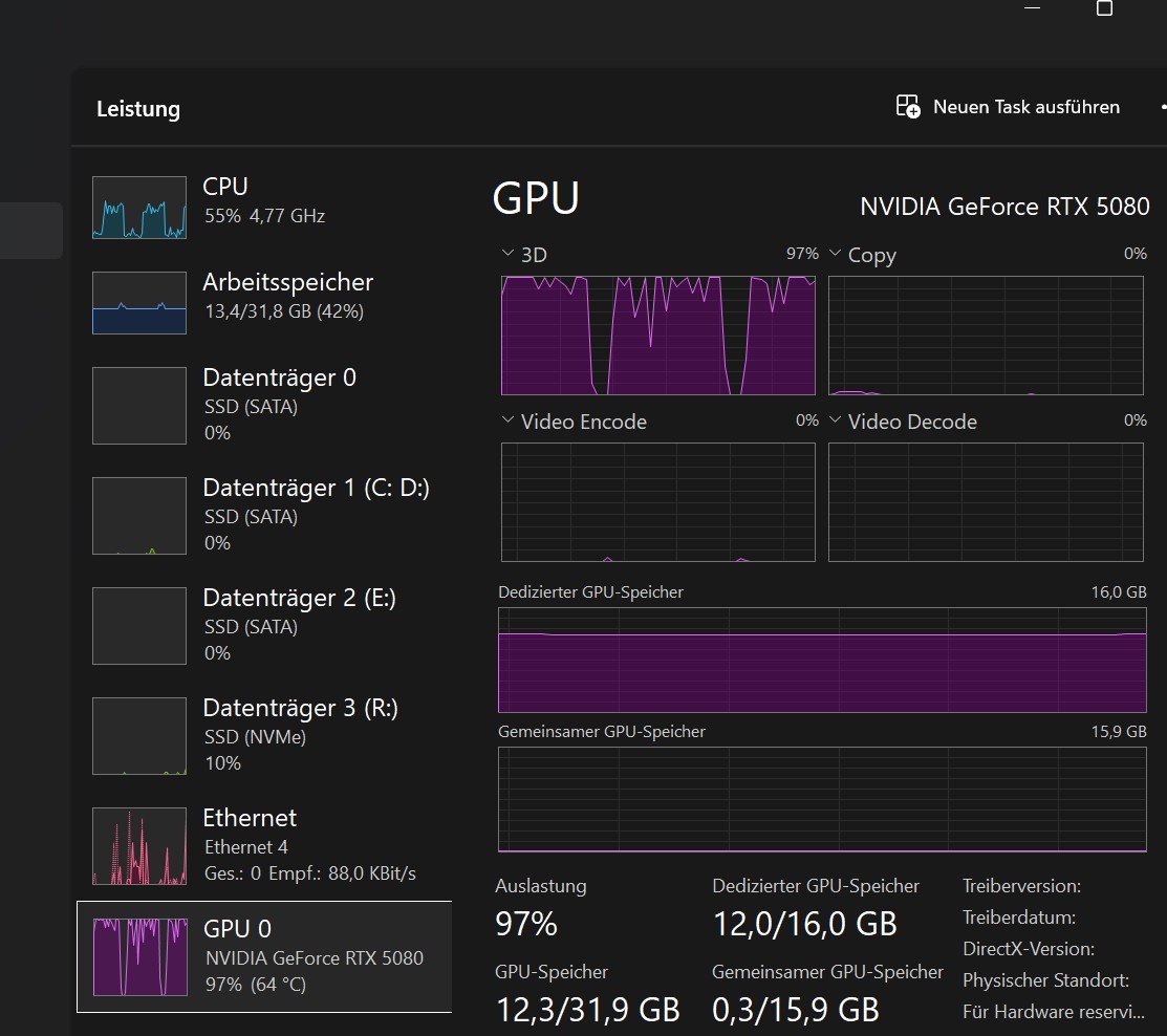 If the RTX 5080ās utilization were between 97 and 100%, as is ALWAYS the case with DaVinci Studio (where AI calculations are almost always part of the timeline), I would only have to wait 5 hours instead of 8 or 10.