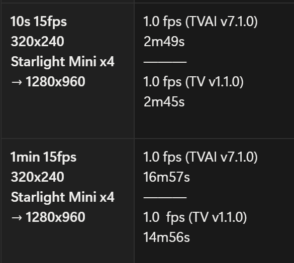 With my 1-minute test clip at a resolution of 320 × 240 and 15 frames per second, a 4× upscale to 1280 × 960 now takes only about 13 minutes instead of roughly 20 minutes.