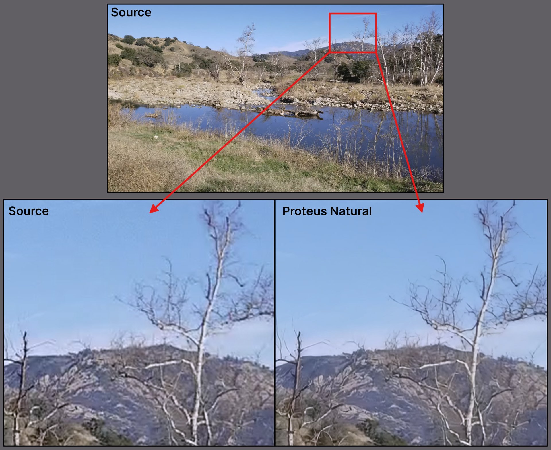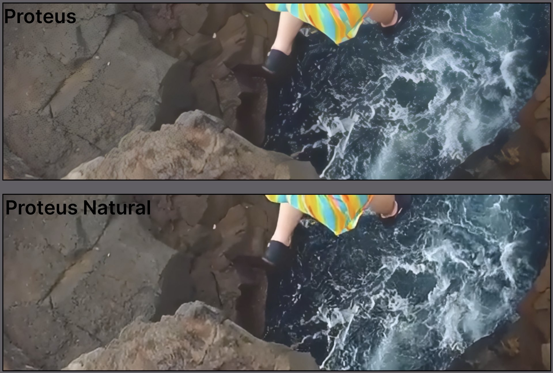 - Though the original Proteus is quite robust, at times the background texture can appear extra sharp, crunchy or flattened with some details. Natural takes this into account and minimizes these types of issues. The example above clearly shows the issue within the water and the texture of the rocks.