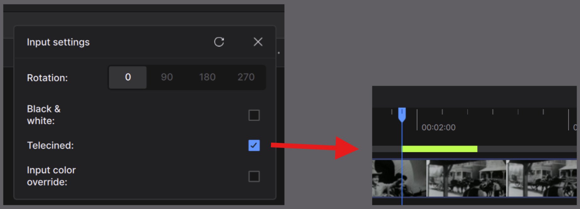 - Previews with telecine turned on will display in the timeline. Previously doing a preview while Telecine enabled did not display the green visual notification of the processed preview on the timeline.