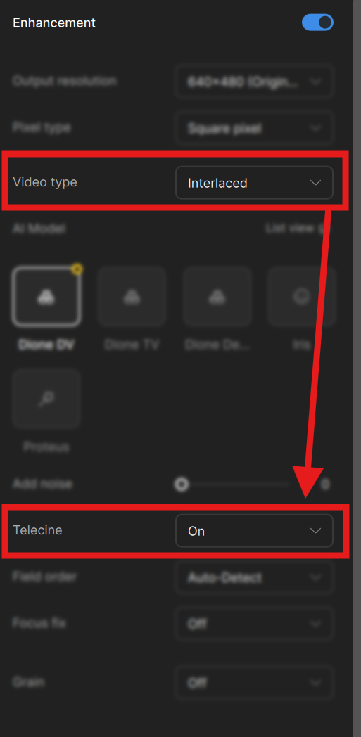 Telecine has been moved to the right panel, under “Interlaced” enhancement for more visibility. Moving this under a category that makes a little more sense will help one find this option faster rather than remembering to look into the settings menu.