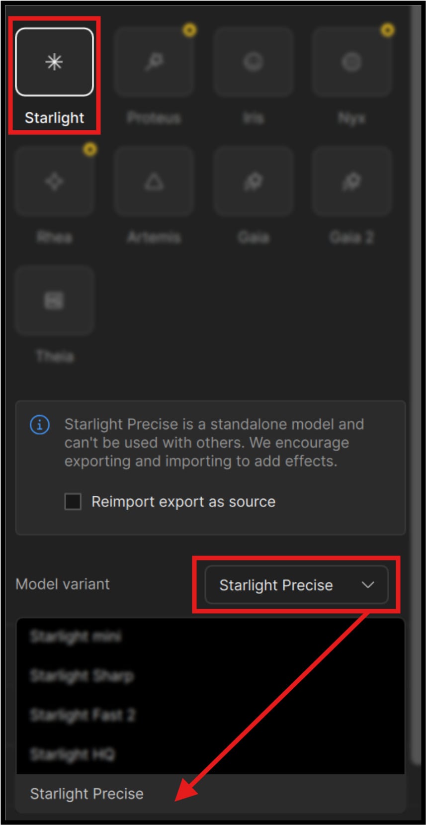 The ‘Reimport export as source' option, after finishing with Starlight model (probably every one, but I had Fast 2 at the time), shows me black video in the ‘editor’, even though the result video is totally fine, and I can see the frames at the bottom.