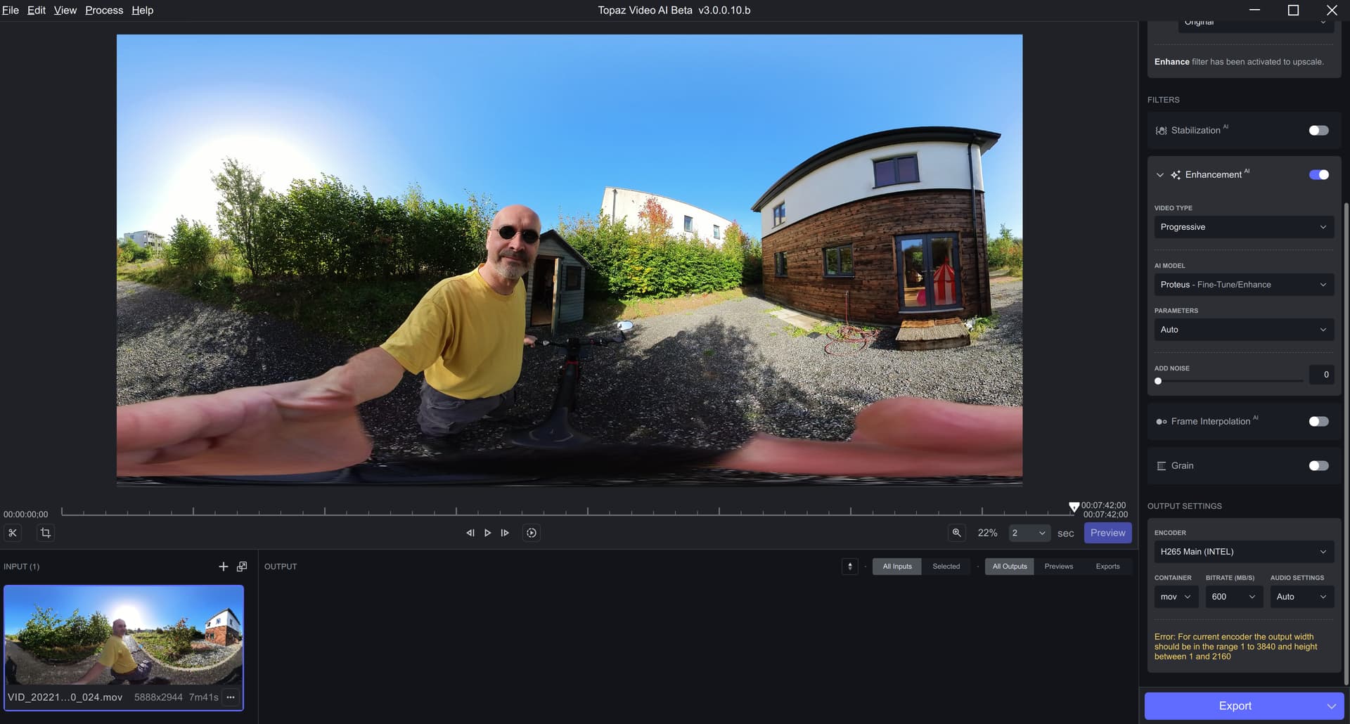 Hi - it looks like the input/output resolution is too high for the default encoder. Can you please try with a different encoder like H265 or ProRes?