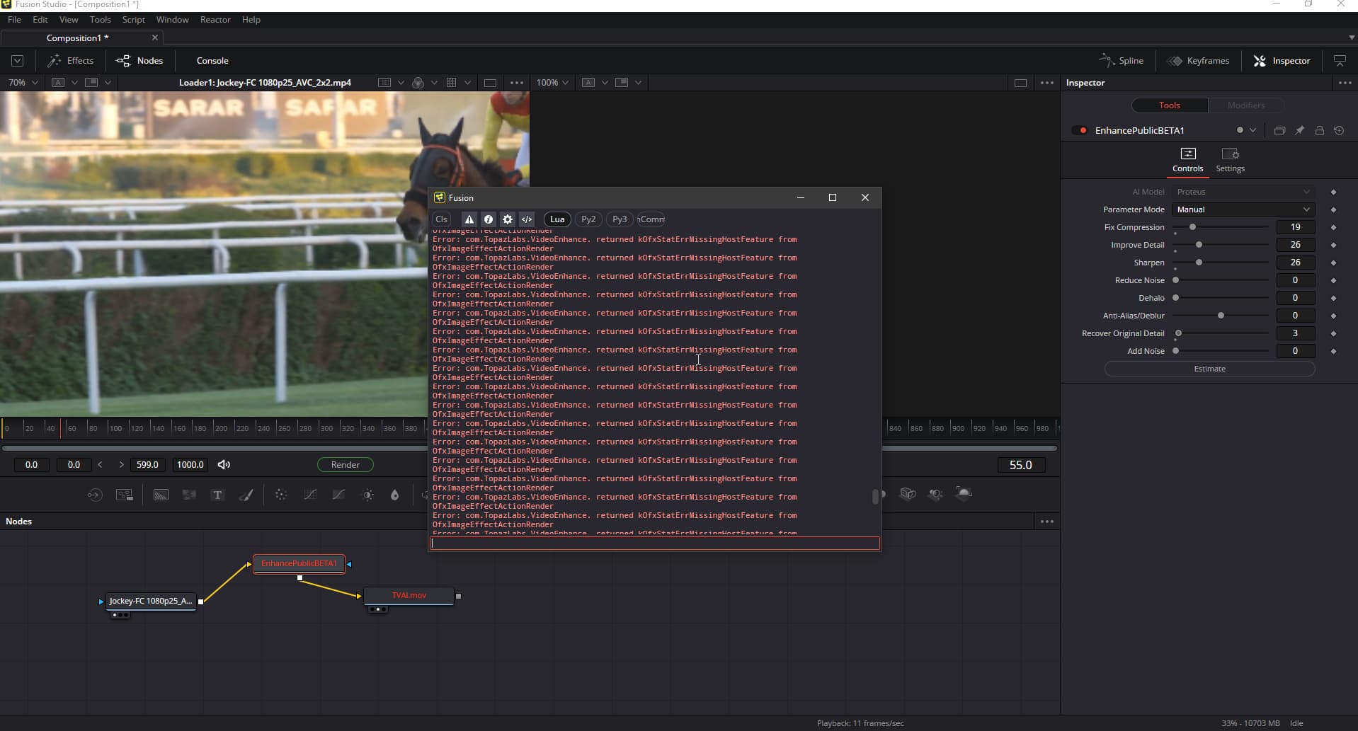 I have Fusion Studio 18 and use it from time to time. Wasn’t even thinking that the TVAI plugin could work with Fusion stand stand alone, but it is there. However, when trying to render a simple job with a loader, a saver and Enhance in between, the console throws a bunch of error messages when trying to render.