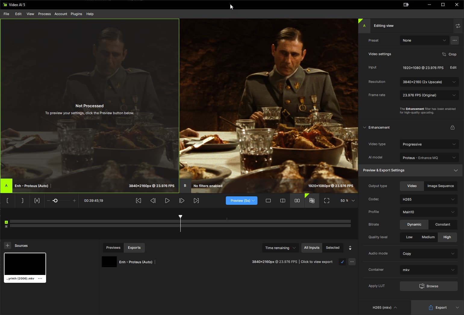 VIDEOAI : Enhanced using prob-4; mode: auto; revert compression at 0; recover details at 0; sharpen at 0; reduce noise at 0; dehalo at 0; anti-alias/deblur at 0; focus fix Off; and recover original detail at 20. Changed resolution to 3840x2160