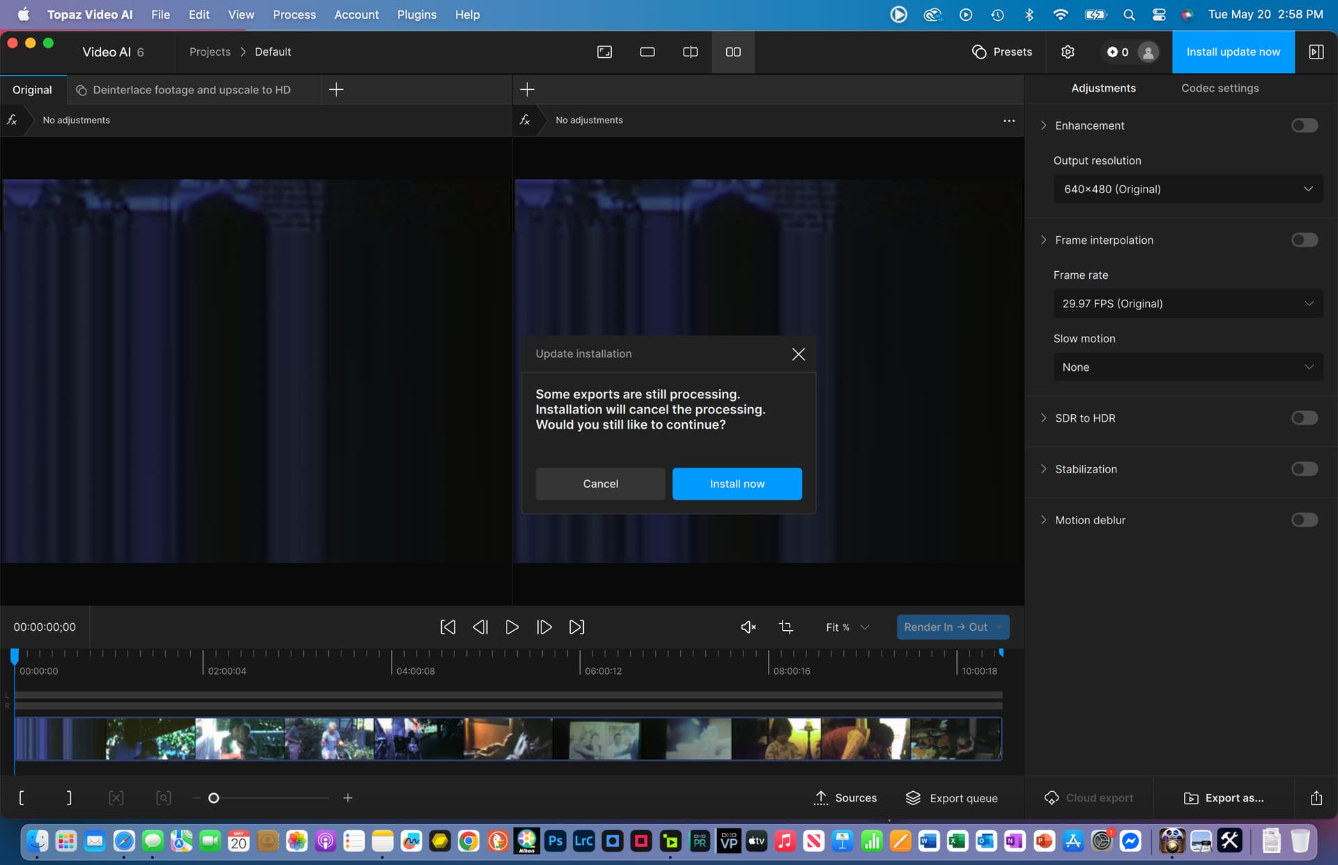 Have tried several Video AI 6.0 to current version (6.22). Files download, but clicking “Install” leads to window called “Update Installation” shown in first screenshot. Nothing is exporting. Regardless, the “Install now” button does not respond. This has behavior has recurred several times.