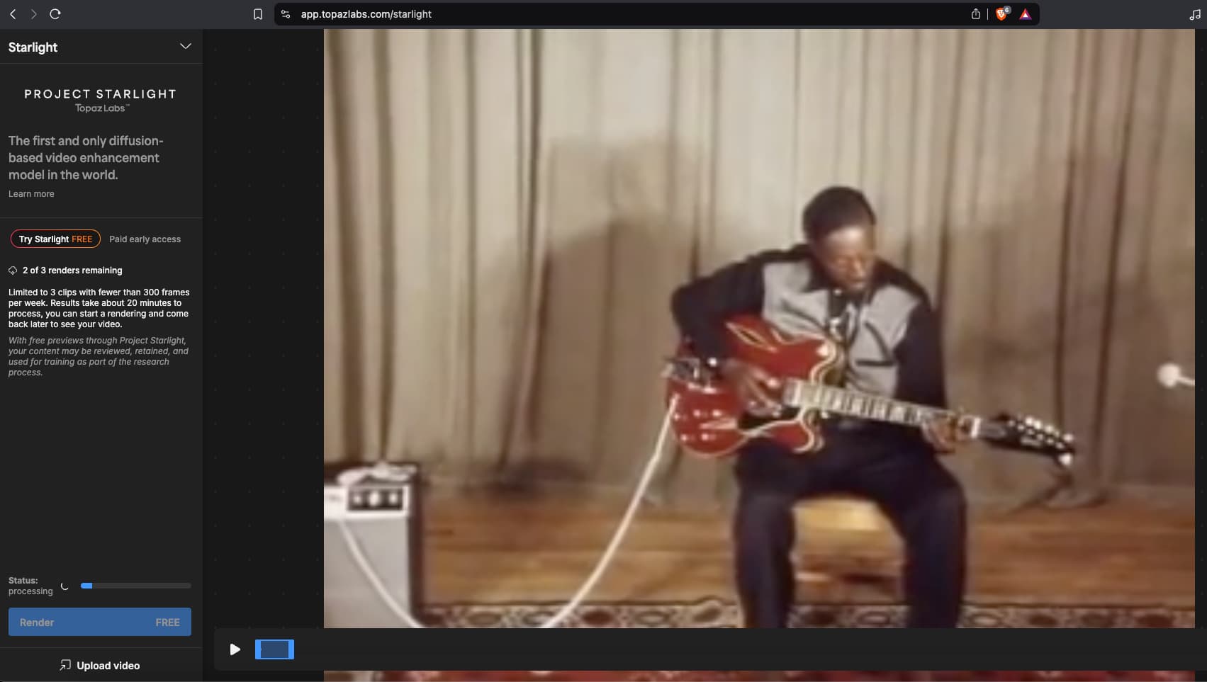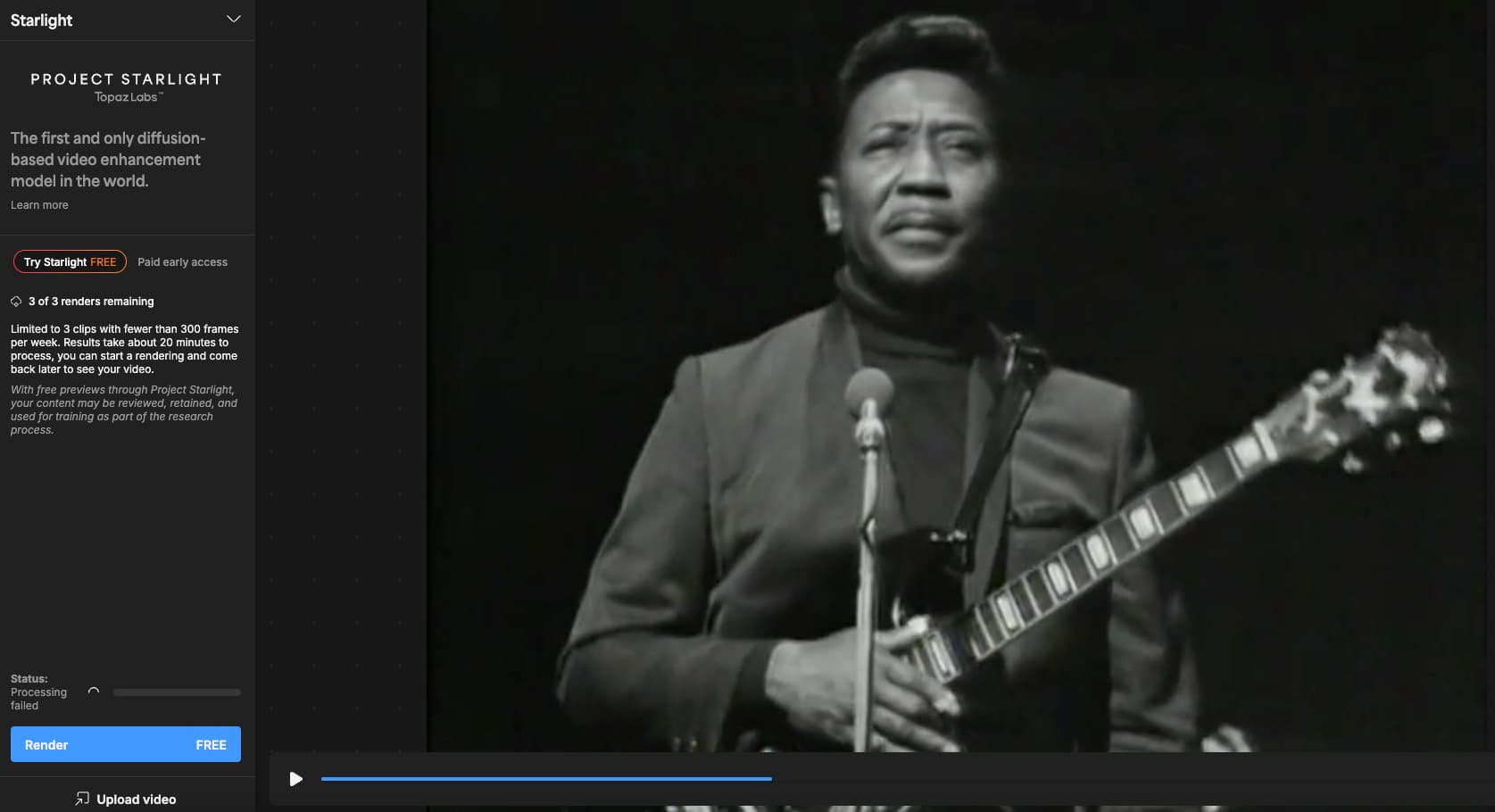 I chose a random video I had saved from the web (Got My Mojo Workin’.m4v, 39MB). First I trimmed it in the Mac Finder QuickLook view because the Starlight site says, “Limited to 3 clips with fewer than 300 frames”. Does that mean the user has to prep the samples first? Hard to tell.*