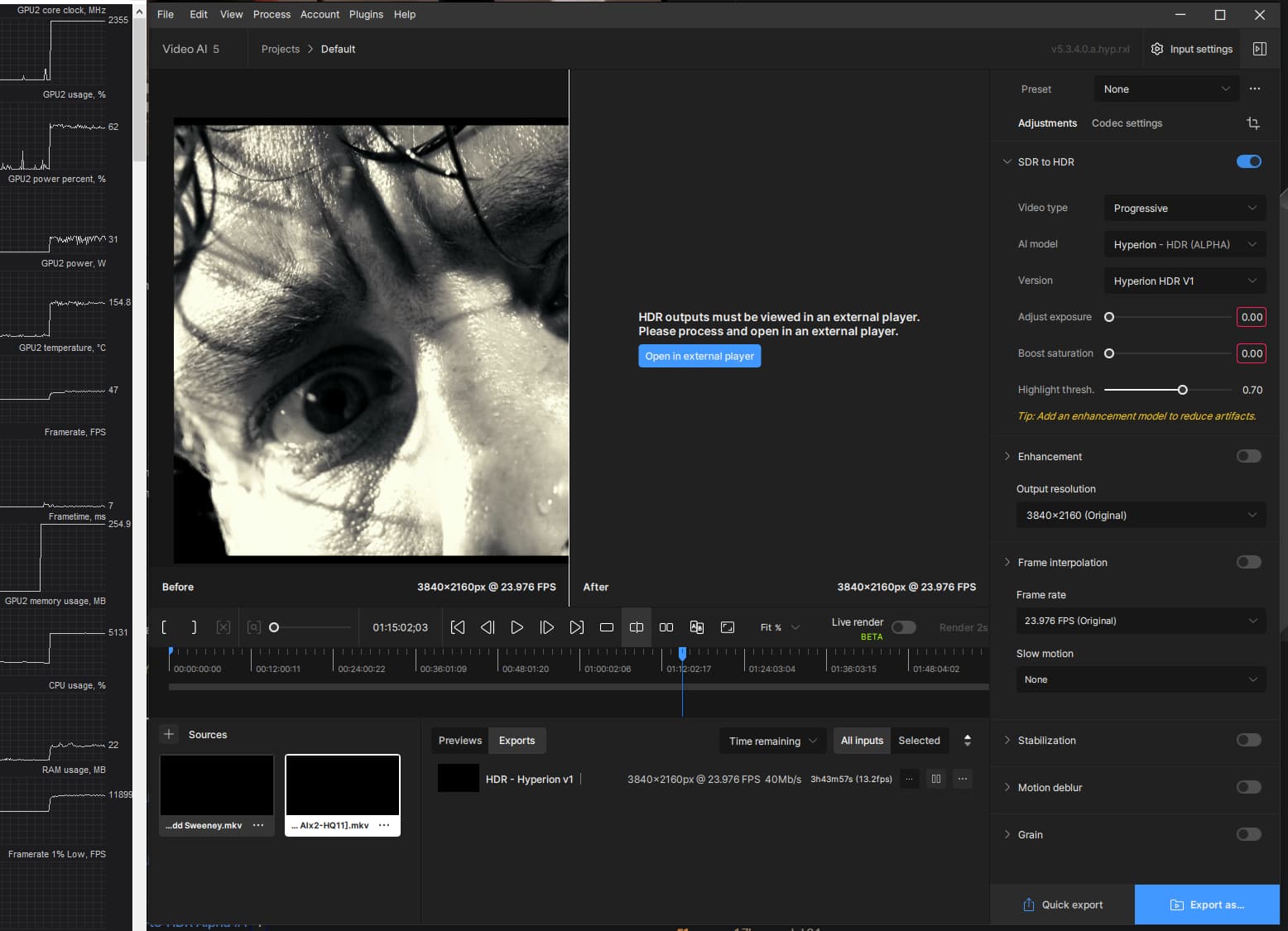 After being massively disappointed by Hyperion Alpha 4, Alpha 5 delivers the best results I’ve seen from this model so far. At this point, it no longer feels appropriate to call it an alpha. The SDR-to-HDR conversion now produces such high-quality results that I’m consistently satisfied, even with previously challenging videos and scenes.