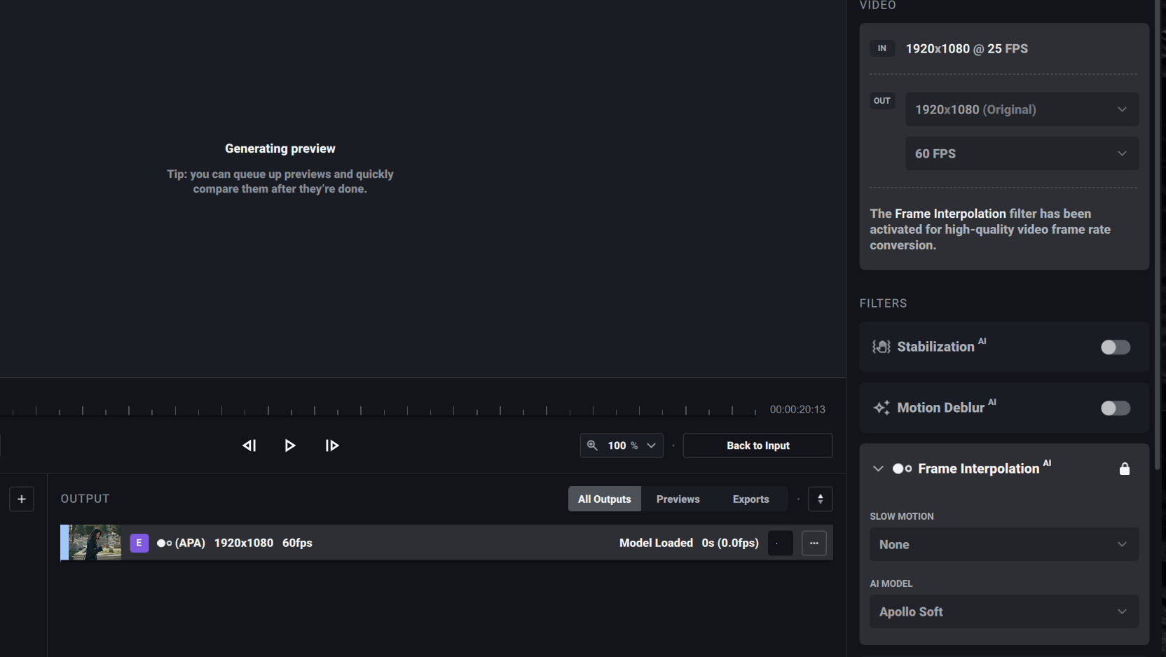Let it sit for 4-5 minutes it will start, keep an eye on your cpu usage. IM finding the apollo soft model and the new de-blur model are only running on the CPU for some reason. Hence the slow loading and processing times.