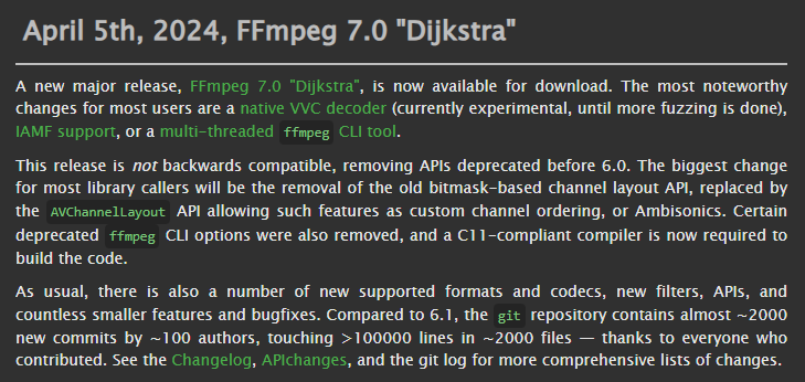 We update ffmpeg regularly so you can expect some of these changes to make it into Video AI’s ffmpeg bundle soon. Our build will not line up exactly with the numbered versions that ffmpeg announces since we pull specific changes and rebuild with our models enabled.