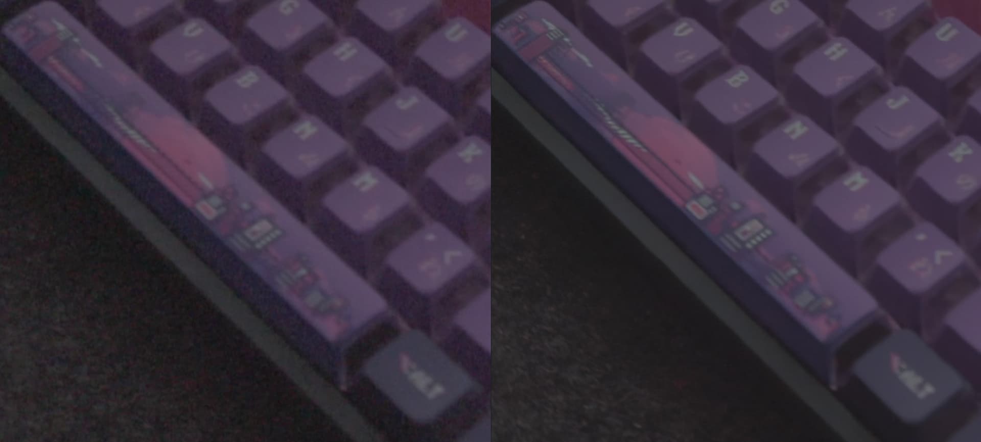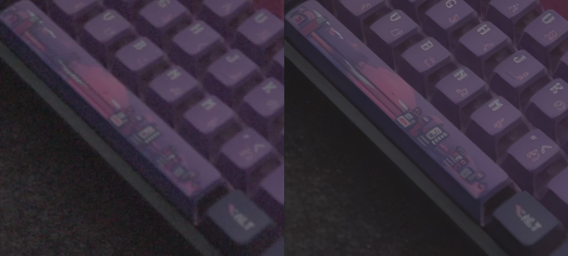 Proteus v4 does have much âstongerâ lines around the keycaps in the video, and it does do a better job at denoising than Proteus v3 (in exchange for a bloby desk mat). But you can see that Proteus v4 has a harder time upscaling the hard graphics in a clear way. It removes details in some places (E.G. the bridge and some of the buildings on the space bar) while adding false detail/blobs in other places (E.G. Most letters and sub characters). Proteus v3 looks more natural to me.