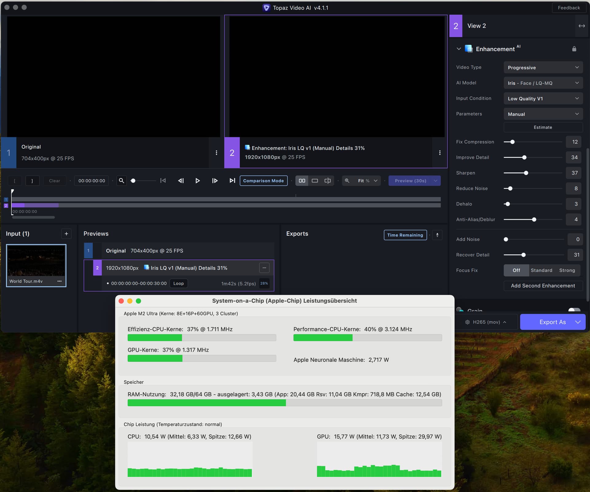 This is a SD → FHD upscale here on my M2 Ultra with Iris and RAM set to 85%: