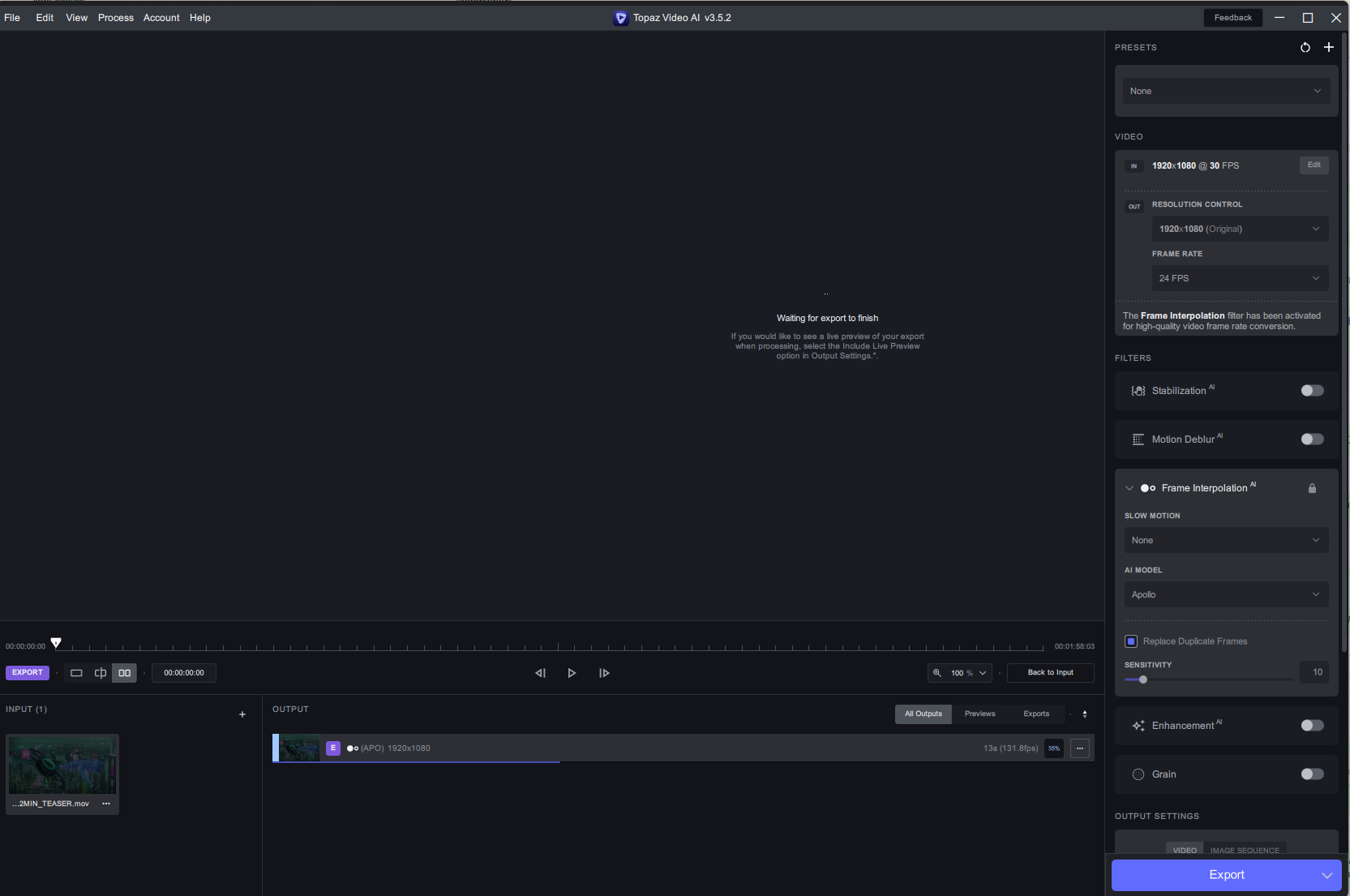 Has anyone else noticed that the files that are encoded by Video Ai, take like double the time to be encoded right after in for example Adobe Premiere Pro? i do very long enhancements, concert size, normally i would have processed a show that has been put through Video AI, that is a hour and a half, in 20 minutes (in adobe premiere pro). Now i have finished my latest show, while still using 3.5.0 as it’s the last stable version for me, the rendering time (in adobe premiere pro) was 4 and a half hours!
