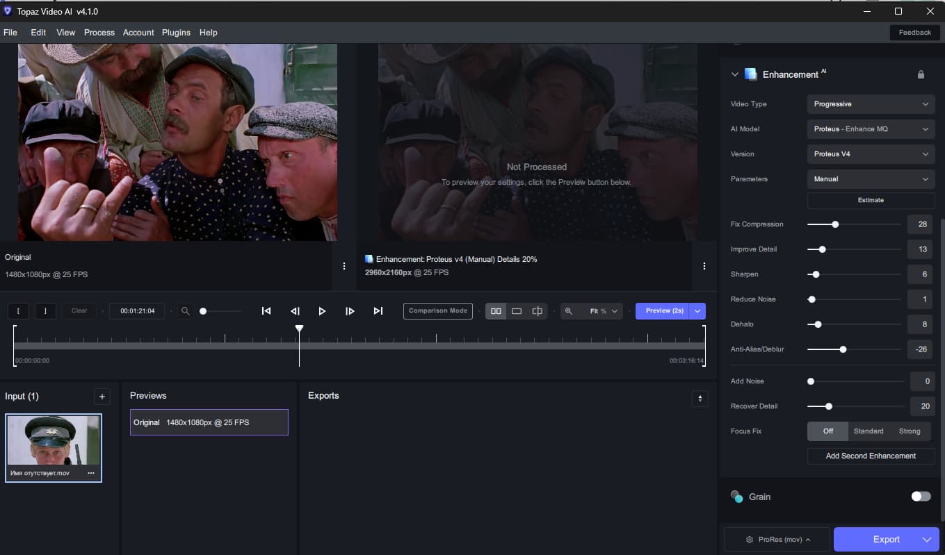 TVAI gives the best video when it interferes with it the least. Pay attention to the screenshot. In all the videos that I upload to TVAI after Davinci, the manual setup score in both Proteus and Iris is almost always the same. I’ve tested dozens of options, the settings evaluator shows the same picture for all medium to high quality videos like in the screenshot. Increasing a parameter leads to distortion in some places. On the contrary, I’m lowering the Sharpen option a bit because I’ve used it enough in Davinci…