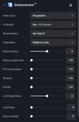 I’m curious how Nyx Fast compares to Neat Video at denoising? I’ve heard some people on here say it cannot adjust for varying levels of noise. My findings so far with Nyx Fast is that it can adjust and does a pretty good job in my eyes. Maybe a little painting-like, but very little. I have it set like this, and adjust the Reduce Noise slider in the most noisy part of the video.