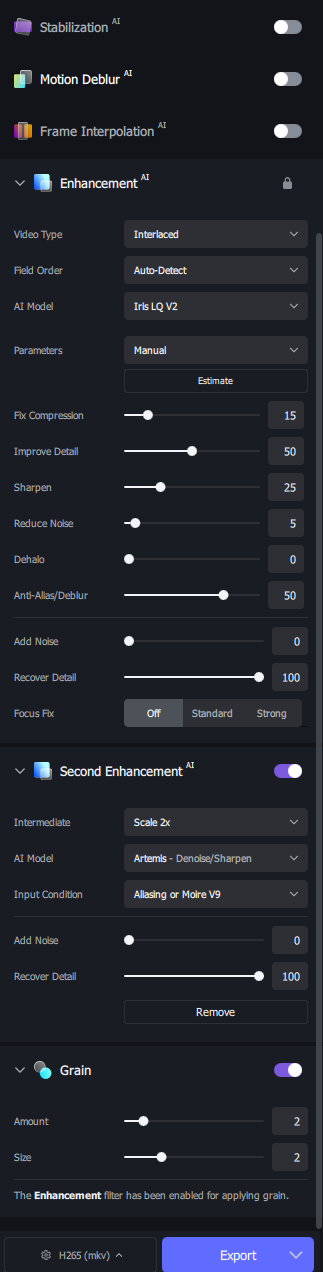 I would highly recommend running the export as an image sequence (just use PNG files unless you have insane amounts of space for tiffs - they are easier to work with). Export, with Artemis V8 at 2x Upscale (200%) should replicate my method for the original file upscale.