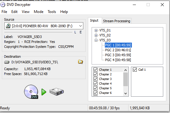 If using the above, you select the episode like below, select Stream Processing and Enable it, then I usually just leave the multi channel audio and video (but thatās up to you) then click the Decrypt, and it will save the VOB file of that episode to a location you choose on the drive.