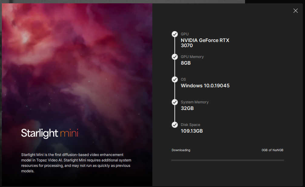 The Models folder is 17Gb at startup, Starlight model download dialog pops up, Models folder gets truncated to 13Gb and a slow download process starts again.