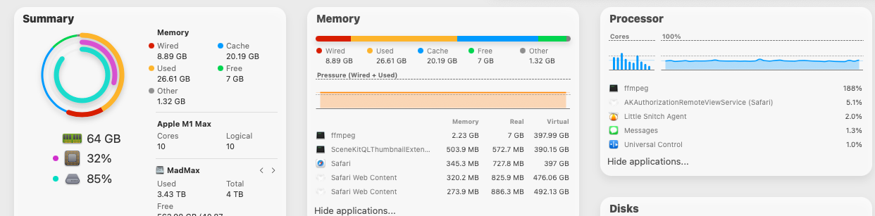 TVAI: v3.1.5. I have a 4k clip (appx 2 mins) I was upscaling 4x. At the 99% done it issued an out of memory error. This is odd as I have a Mac M1 Studio Max w/64bg RAM. It was the only app running other than the TL site in Safari. I tried the same process with upscale to 8k and still got an out of memory error. Using default 422 ProRes, stabilize, jitter, denoise.