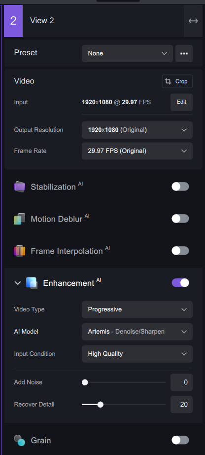 There’s a large Topaz watermark in the middle of my video. I imported a 1080p video with 29.97 framerate and left those settings alone, then I chose the Artemis model on HQ.