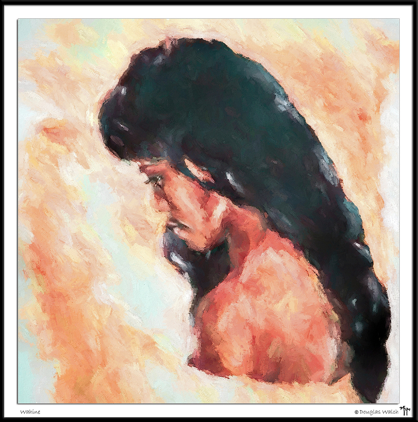 'k den. I decided to give AI Remix a spin to see how it fits into my mind’s eye. I found the original image for this rendering in the “archival” shed at Kona Village. The image was a print and it was it in REALLY sad shape. The print appeared to have been torn out of a frame and unfortunately there was no reference to the artist. When I saw it, it seemed to me like she needed saving. That, and I did the best I could to paint her as I saw her. Thank you Topaz Studio and Adobe Photoshop.