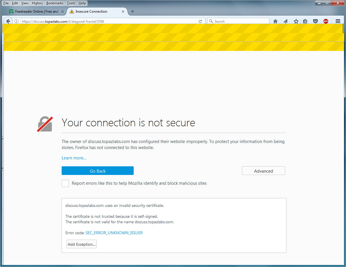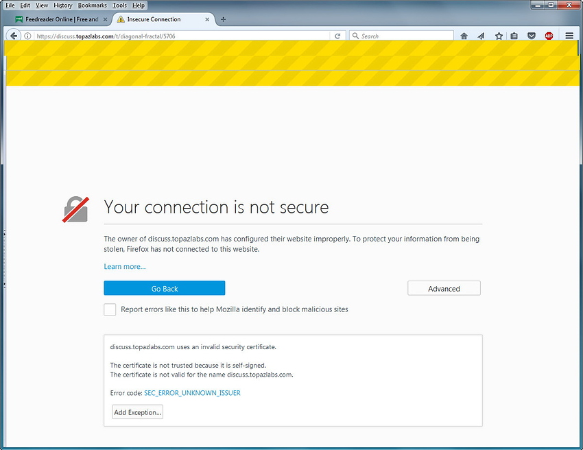 My reply above was via email and I did not add the exception. This reply is via a second visit to discuss and I did not have a certificate error. I think Topaz switches servers during the day and one of them has a certificate error while the other does not. I know this because I get double entries on my feed reader for the same topic and one I can access while the other I can not.