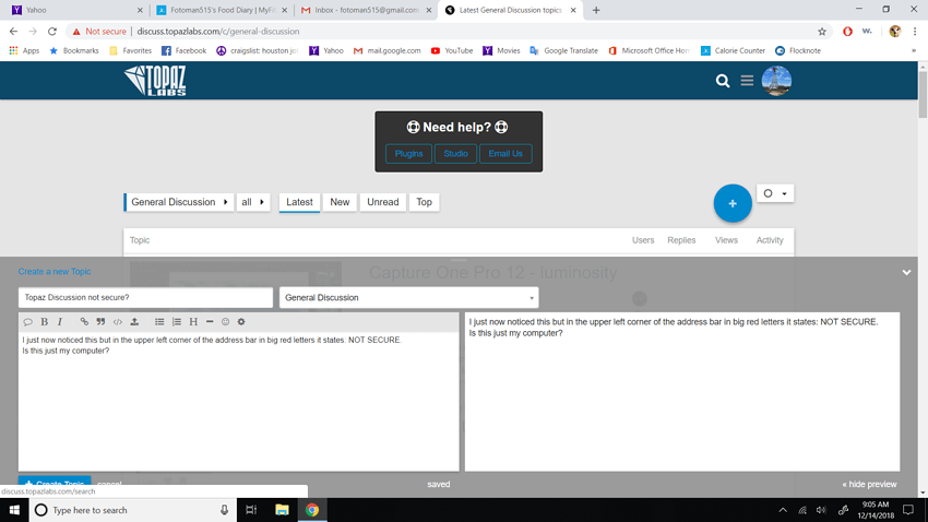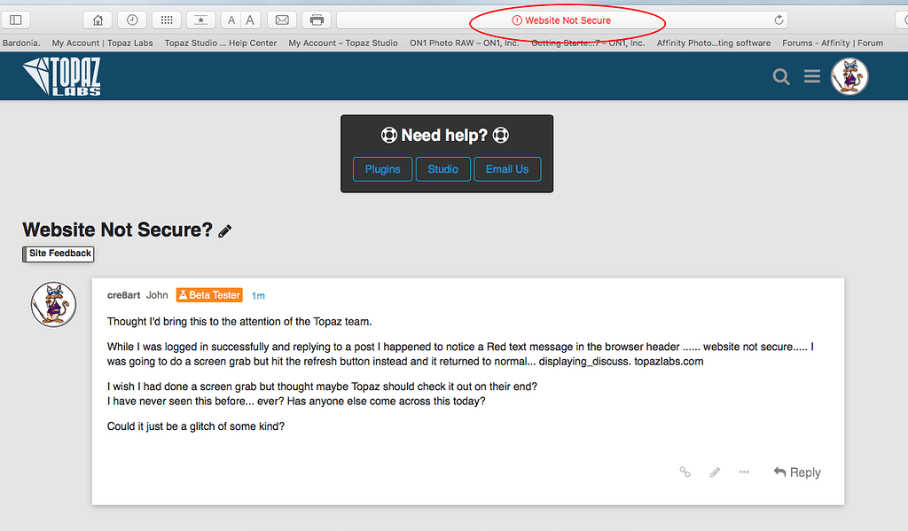 While I was logged in successfully and replying to a post I happened to notice a Red text message in the browser header … website not secure… I was going to do a screen grab but hit the refresh button instead and it returned to normal… displaying_discuss. topazlabs.com