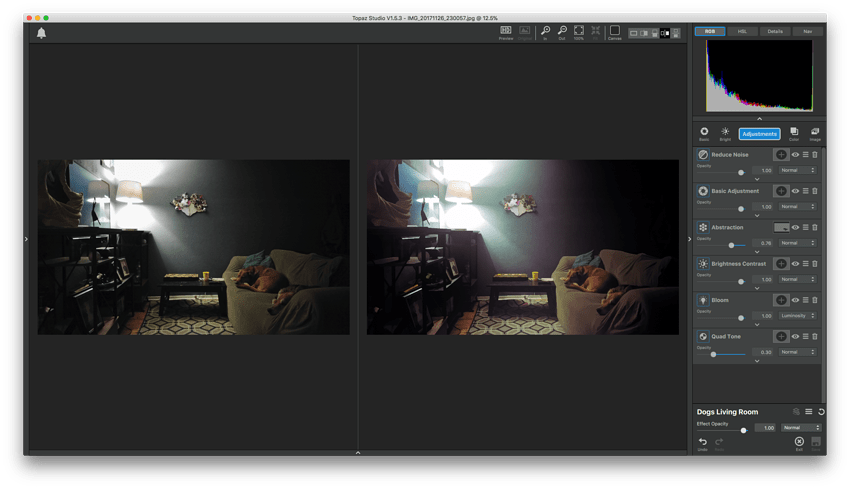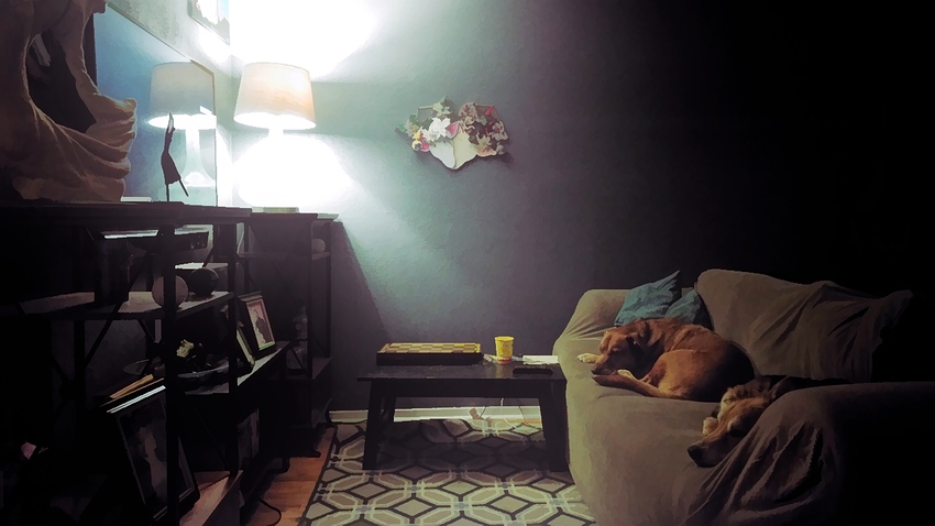 This is my living room, where I live! Pictured are two of my three faithful pups, Takei (far) and Ubuntu (near) The decoration in the middle was made by my daughter, and the sculpture just inside the left side of the frame was made by my wife. This is how I relax after a long day helping customers. I shared the Adjustment Stack I used on this image as a preset named “Dogs Living Room”. I used a brush mask on the Abstraction Adjustment in order to allow the dogs to show through a bit better, but all other Adjustments were unmasked. As a final touch, I introduced a bit of quad tone to the image, using the Vaporwave Adjustment-preset, with light opacity.