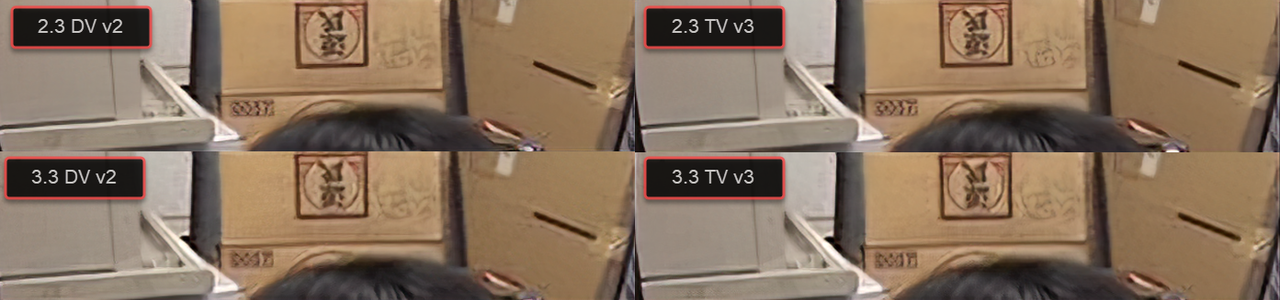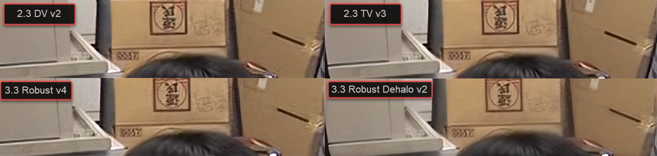 Even then, the 2.3 results are better: cleaner, less noise, better at preserving shapes in the logo and the details in the kanji, less halos⦠and with a smoother 59.94 output.